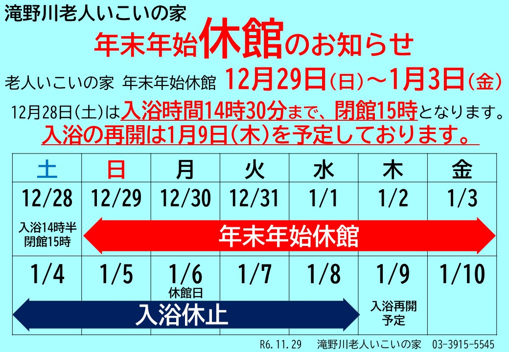 新年は1月4日(土)9時から開館、入浴は1月9日(木)再開予定となります。