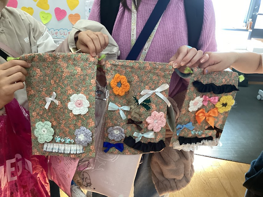 毛糸で手作りされたお花やリボンなど、楽しそうにモチーフを選び、自分なりの巾着袋が完成✨