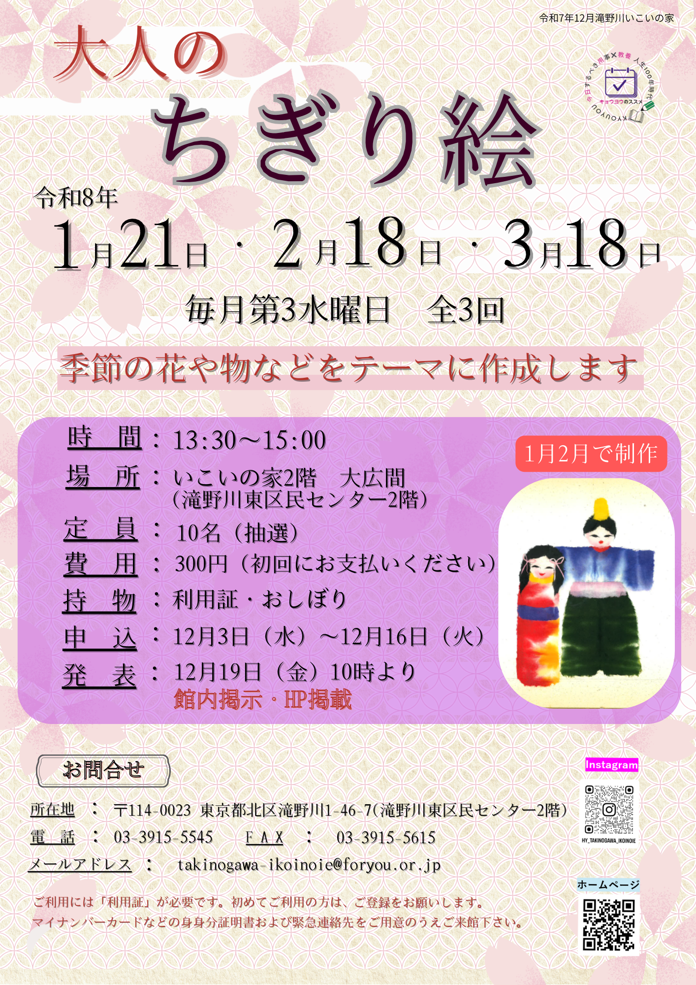 「大人のちぎり絵」講座3回コース(1月~3月)募集中です!