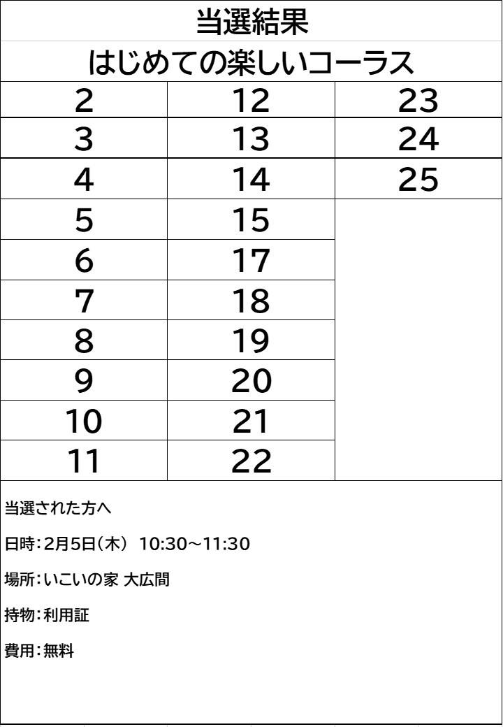 2026.01.30 NEW お知らせ 【当選発表】はじめての楽しいコーラス(2月) Tweet シェアする 滝野川いこいの家 次の記事 2026.01.30 お知らせ 【講座開催のお知らせ】高校生によるスマホ相談会 一覧へ戻る
