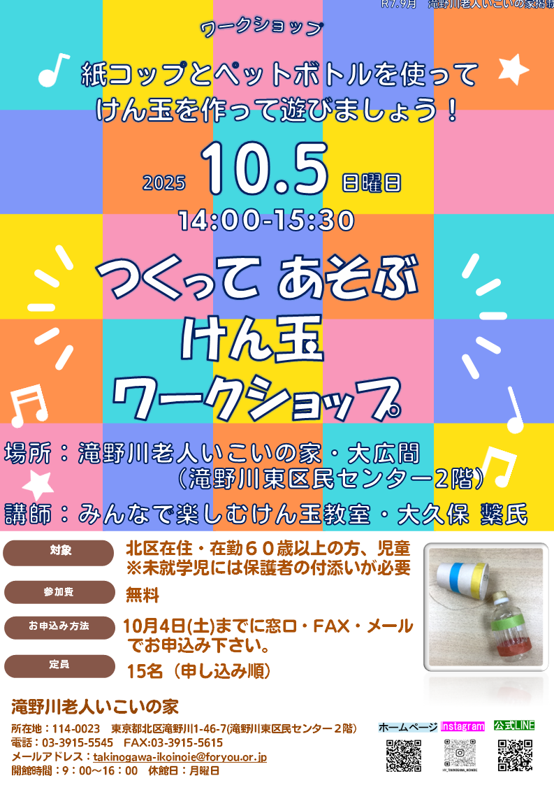 2025.09.20 お知らせ 【北区ニュース9月20日号掲載】10/5(日)開催「つくってあそぶ けん玉ワークショップ!~多世代交流~」 Tweet シェアする 紙コップとペットボトルを使って、手作りのけん玉を作ってみませんか? 先生が、丁寧に楽しく作り方を教えてくださいます。 完成後には、手作りけん玉と木製けん玉を体験できる時間もあります♪ 子どもから大人までご参加できますので、ご参加お待ちしています☆彡 ※未就学児のお子さんは、保護者の付き添いが必要となりますのでご了承ください。 一覧へ戻る