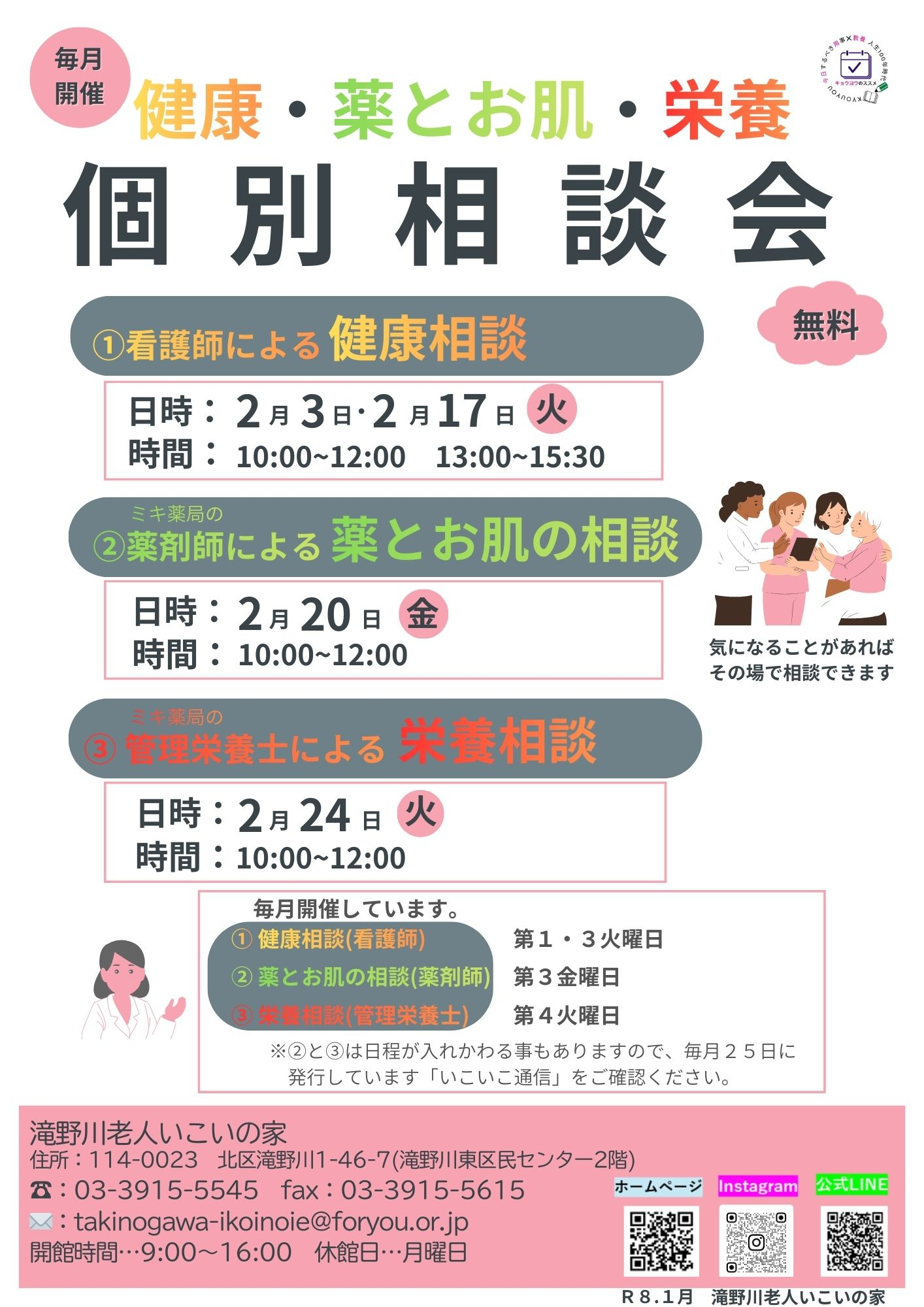 2026.01.14 お知らせ 【北区ニュース1月20日号掲載】 健康・薬・お肌・栄養 個別相談会 開催のお知らせ Tweet シェアする ご相談時間は、お一人約30分間となります!この機会にお気軽にご相談ください。 滝野川老人いこいの家 一覧へ戻る