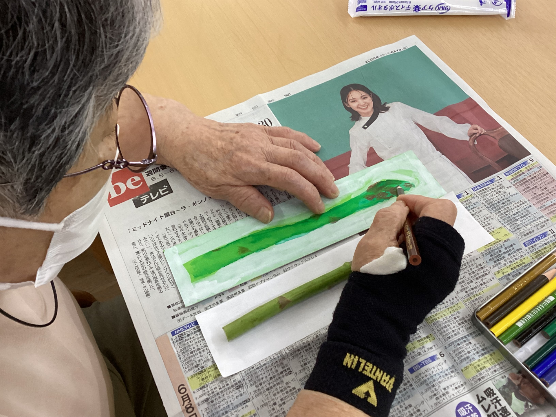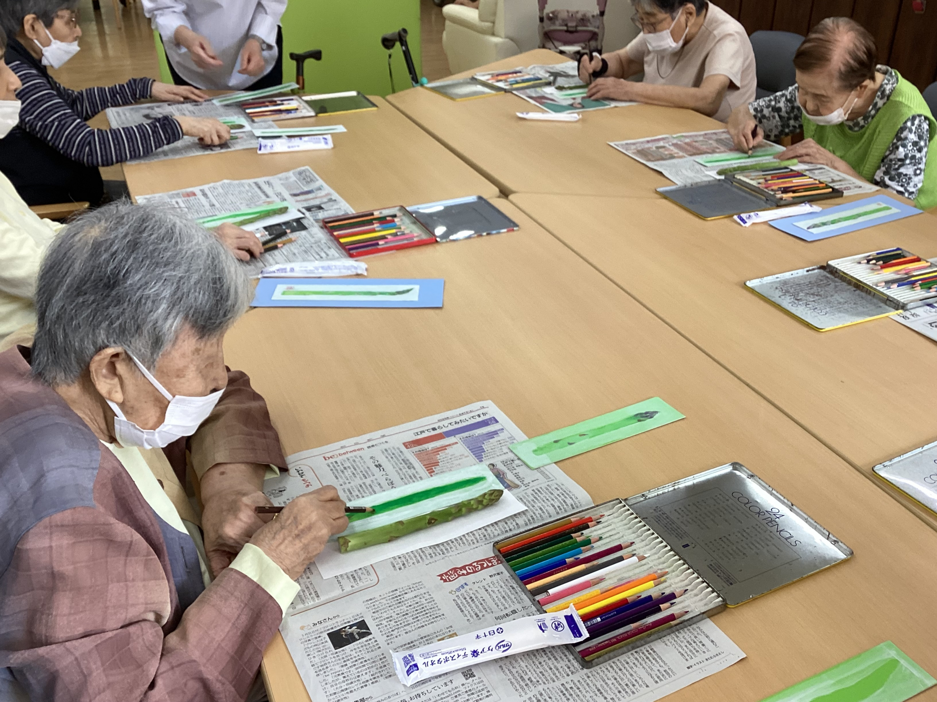まずは「臨床美術」でした。今回は「グリーンアスパラのネガポジ画」のテーマとして