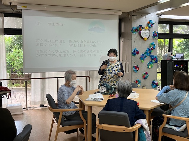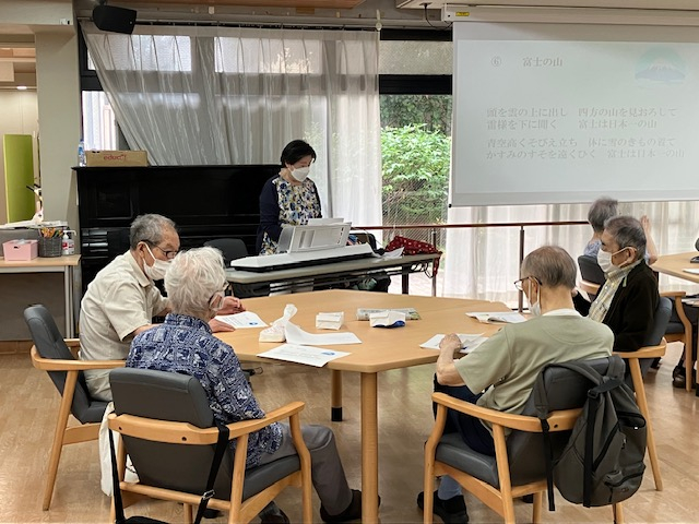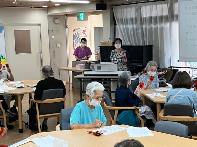 今日のプログラムは「音楽療法」楽器やスカーフを