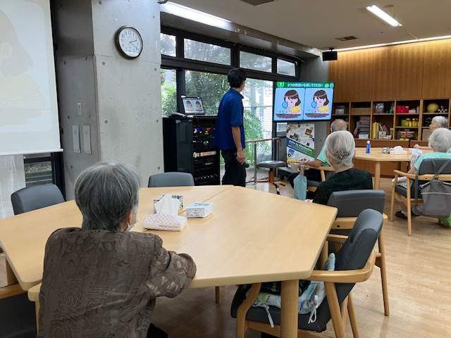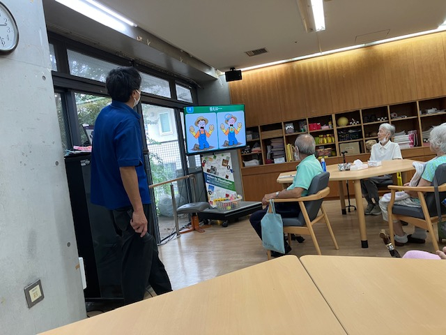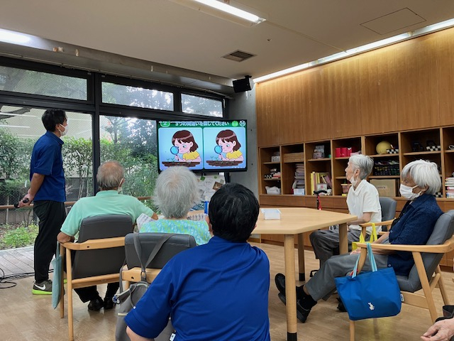 利用者様たちは、テレビを目を開けて姿勢と整えて集中しています。