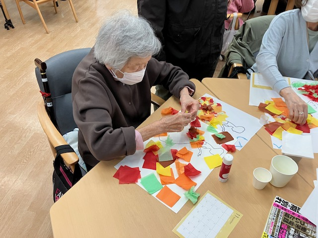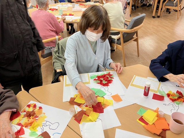 皆さんで、思い思いのデザインに色とりどりのお花紙