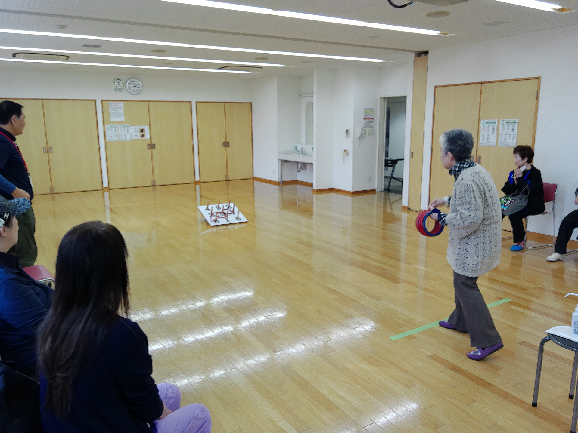 本日は輪投げサロンを行いました。 4メートル先の的を狙い、表示されている点数を合計して競い合います。