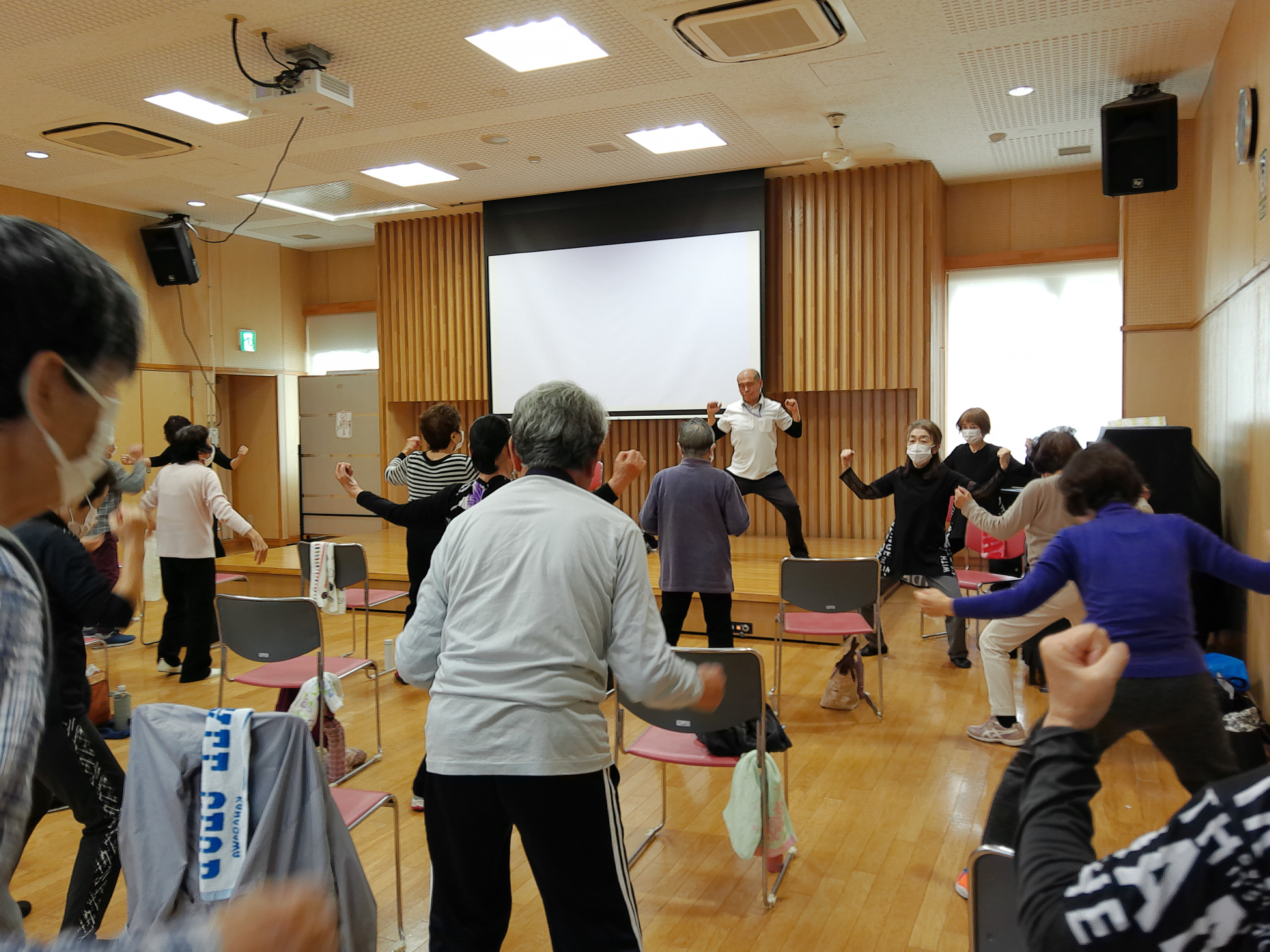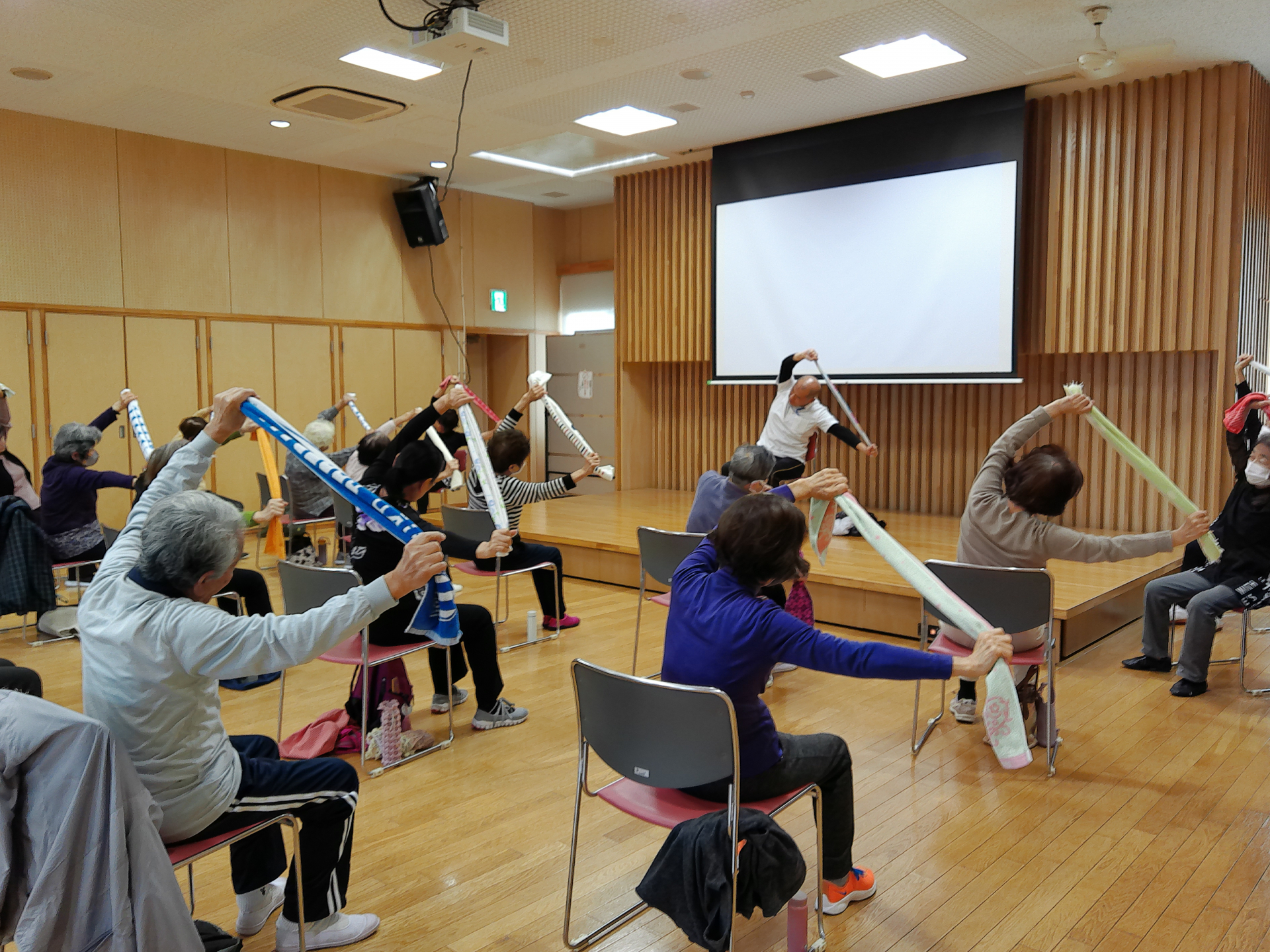 本日の参加者様は前半、後半合わせて70名の皆様がイキイキ体操のメロデイーに合わせて、上半身、下半身を動かしていました。タオルを使用してストレッチ運動を行っているところです。