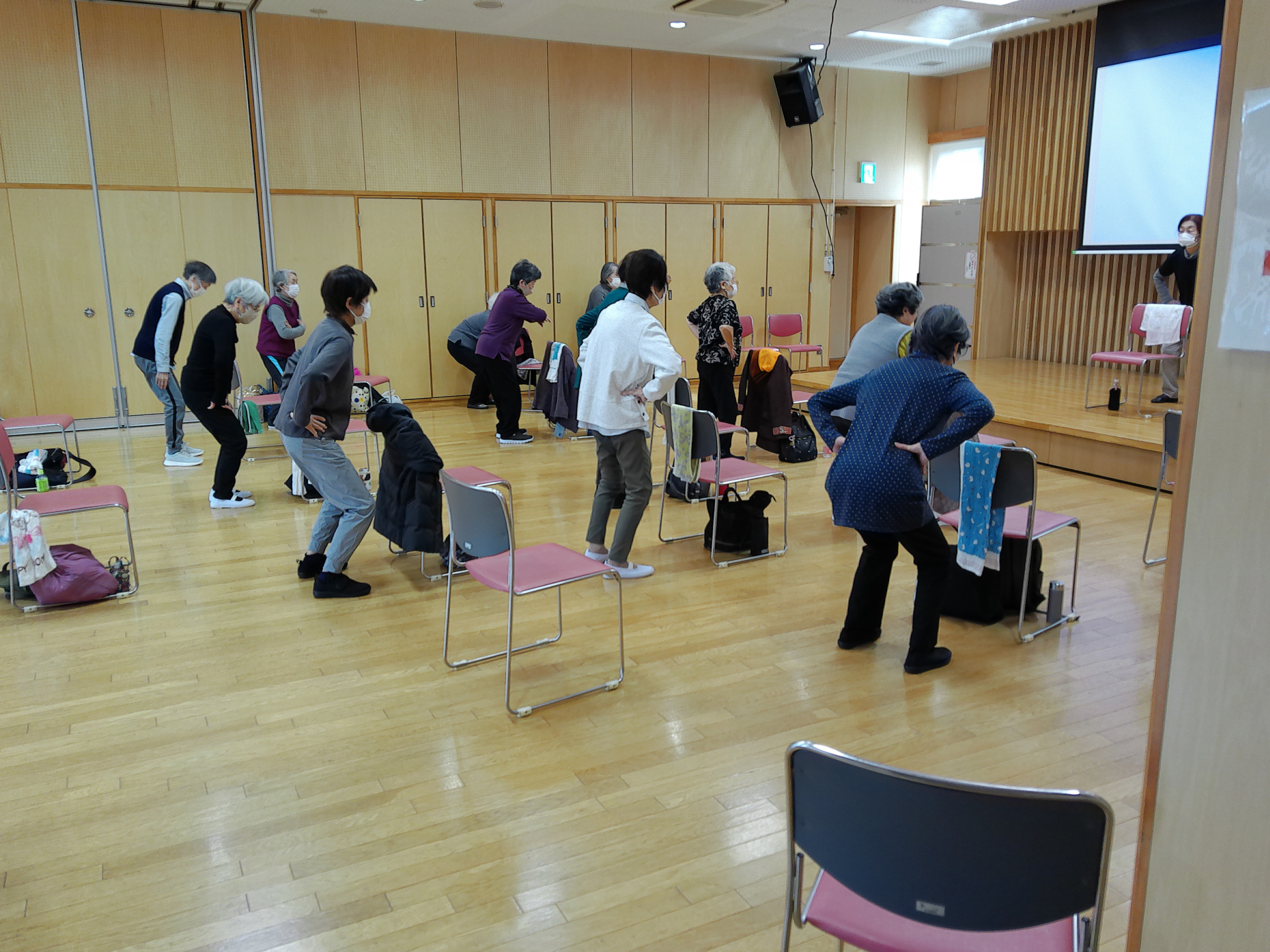 今日のスマイル体操の参加者65名の熱心な参加者様が1部、2部に分かれて運動しました。この時はスクワットを行っています。ヒザが痛い方はお休みされても構いません。ゆっくり短く膝を曲げるだけでも効果あります。