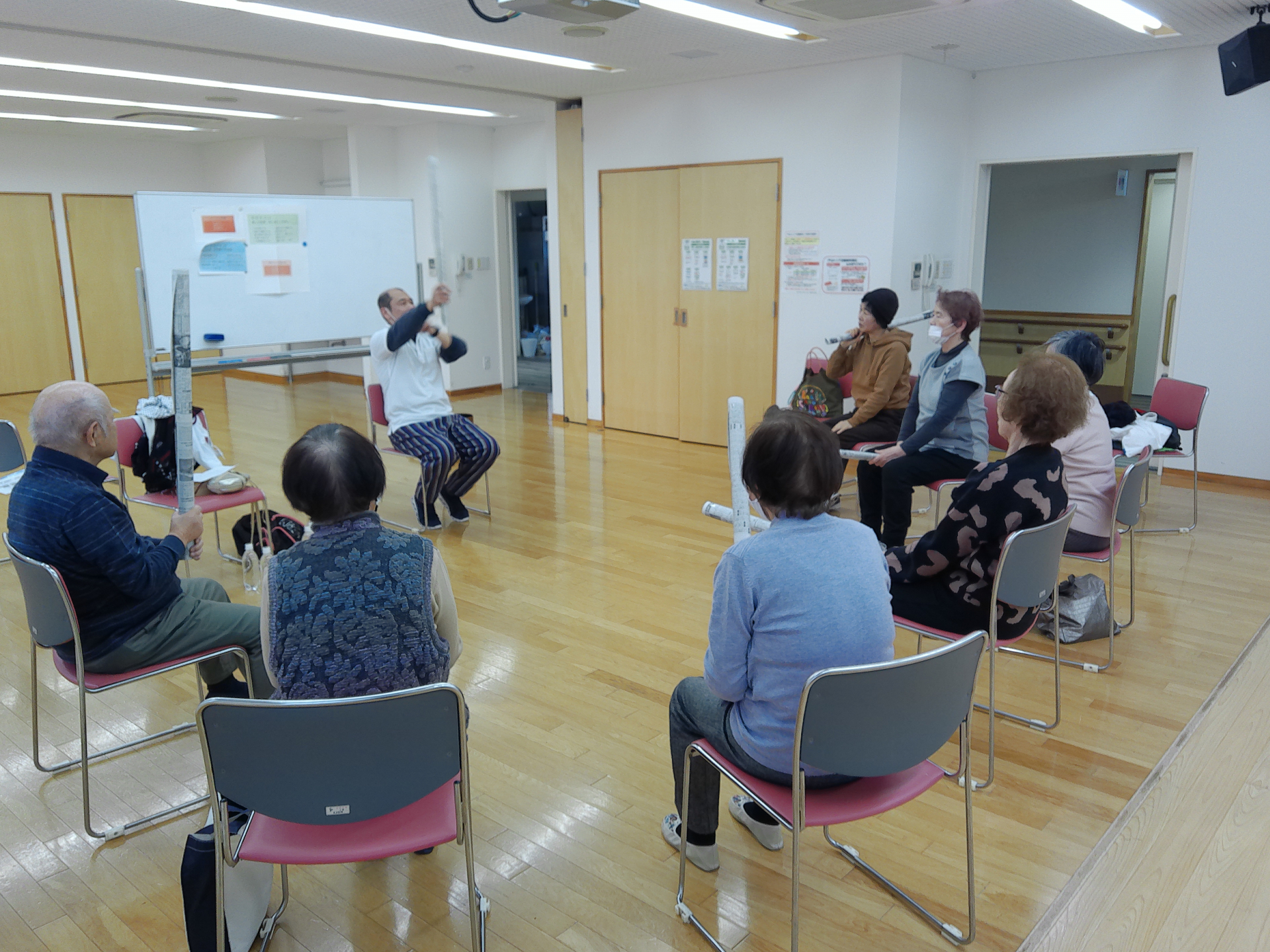 本日4回目を数えました。ペットボトル500mlをダンベルの代わりにして、前後、左右、上下に、動かし、手首、肘、肩周りの関節を動かして筋肉に軽い刺激を加えて頂きました。その後は、頭の体操では棒体操を上から落として素早くキャッチを行いました。写真は素早くキャッチ行うところです。ゲーム感覚を取り入れて楽しく行います。ラクラク健康増進活動はまだ始まったばかりで、皆さんの意見を取り入れながら作って参りたいと思います。宜しくお願いします。及川