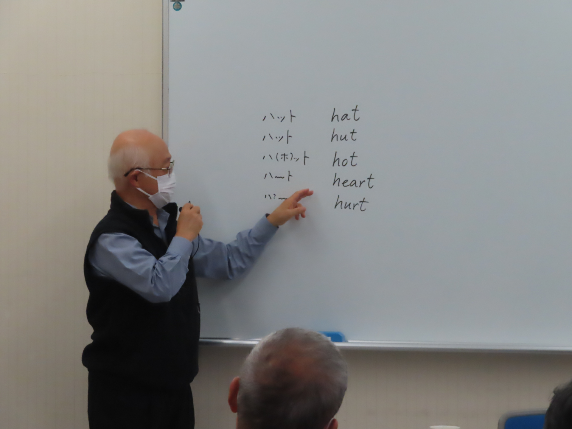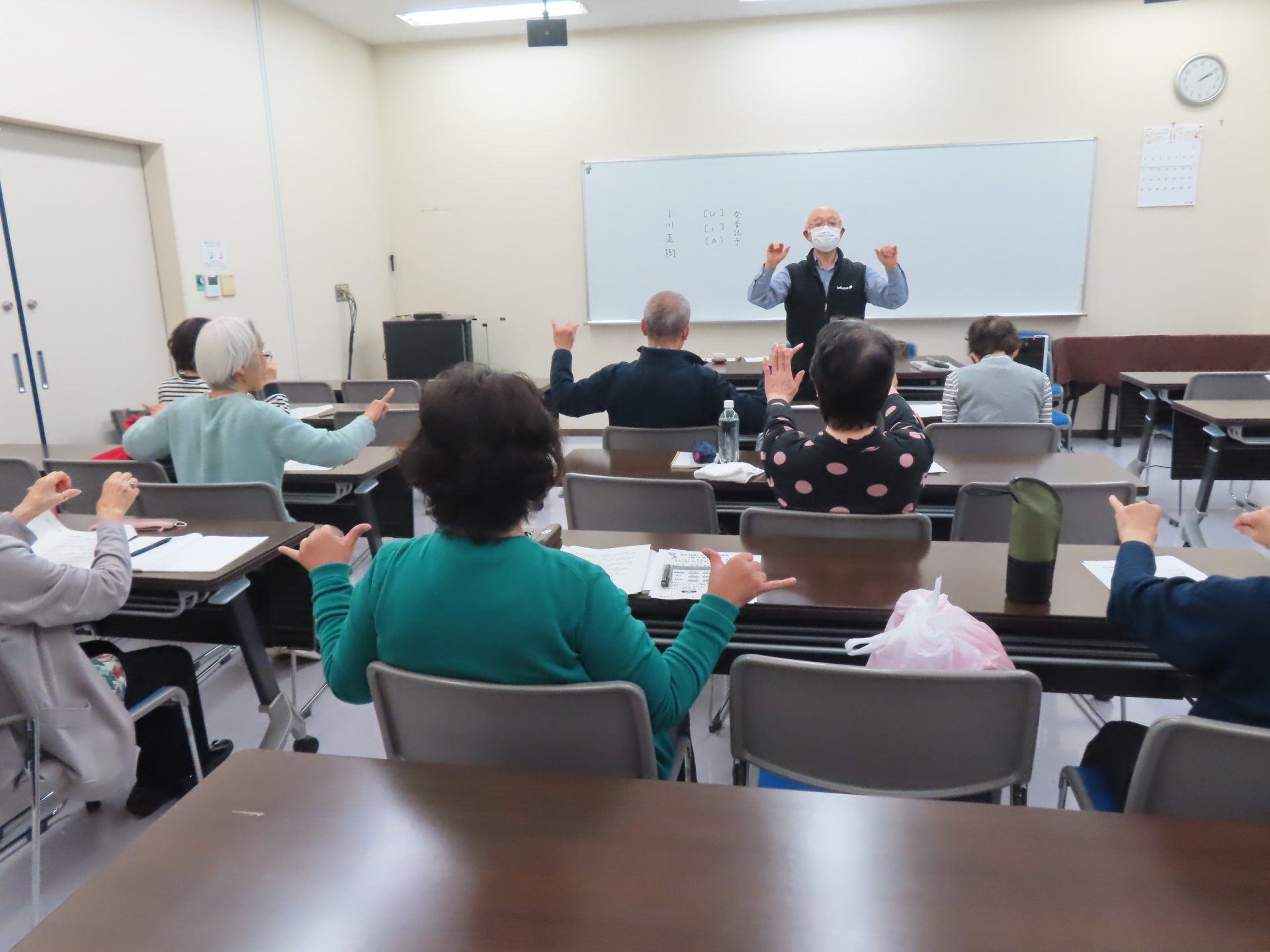 「日本語による自己紹介」のあと、英語の発音を聞いたり、発音体操で体を動かしながら実際に声を出したり、