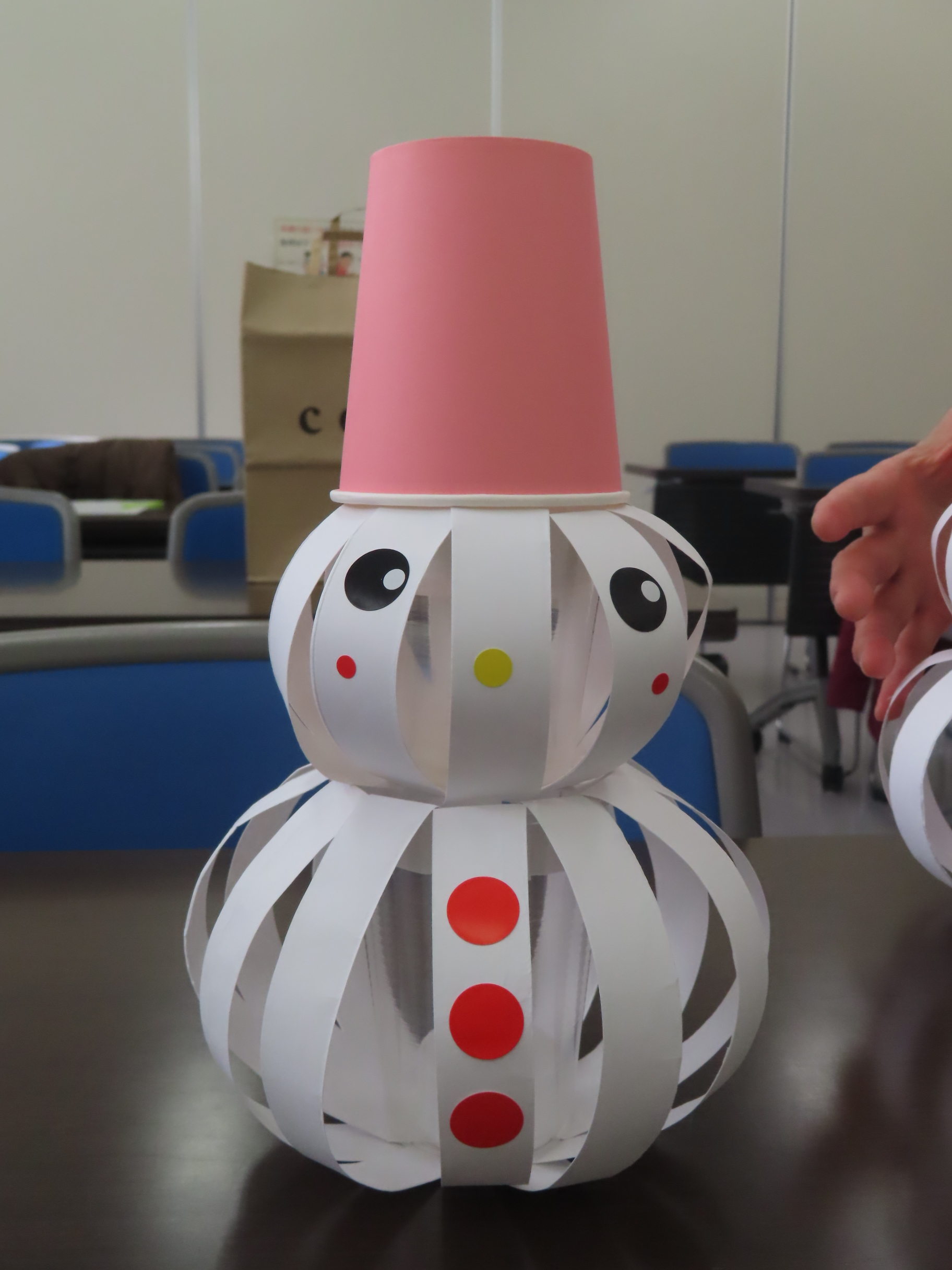 白い画用紙と透明なプラスチックコップで雪だるまを、折り紙でトナカイを作ります。