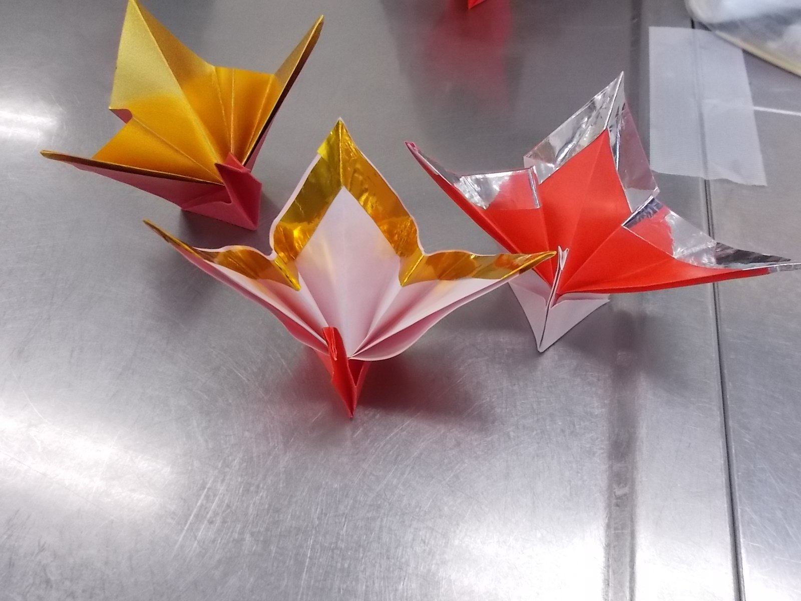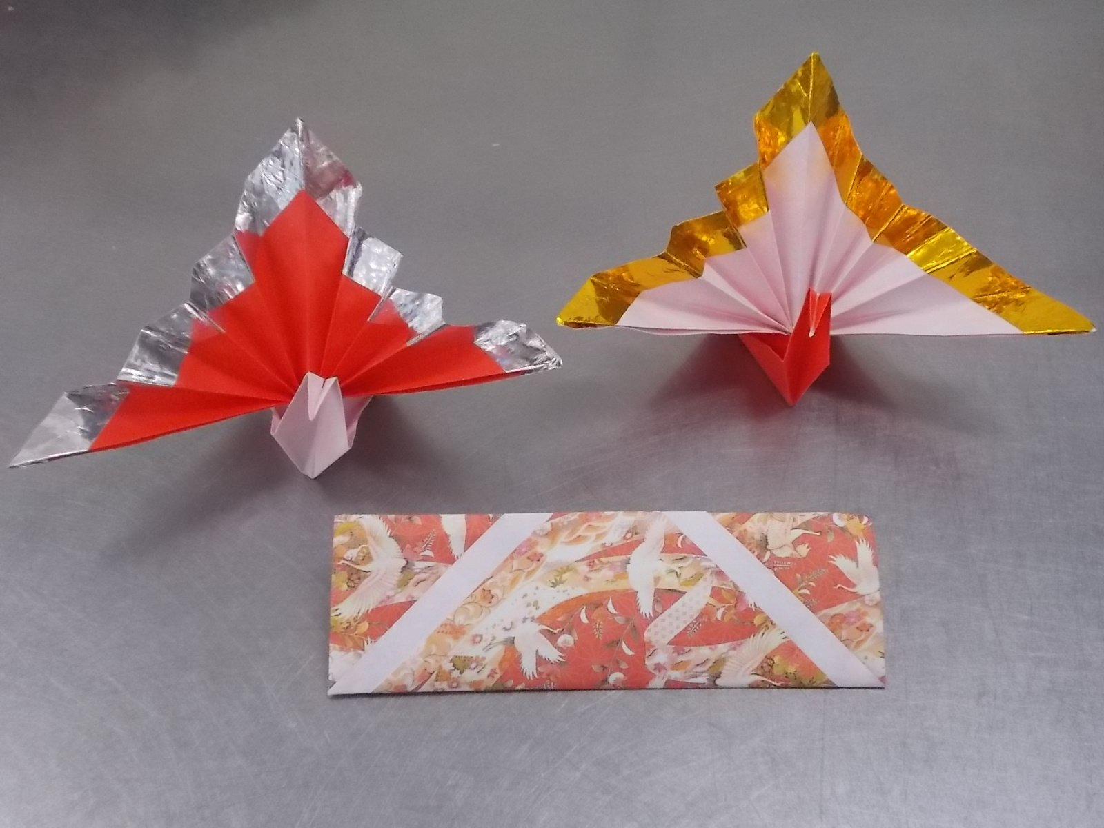 赤と白で2羽祝い鶴を折っていきます。