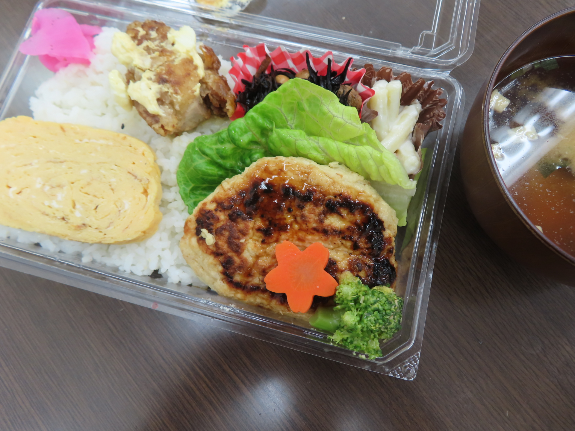 副菜は卵焼き、鶏の竜田揚げ、ひじきの煮物、マカロニサラダなど