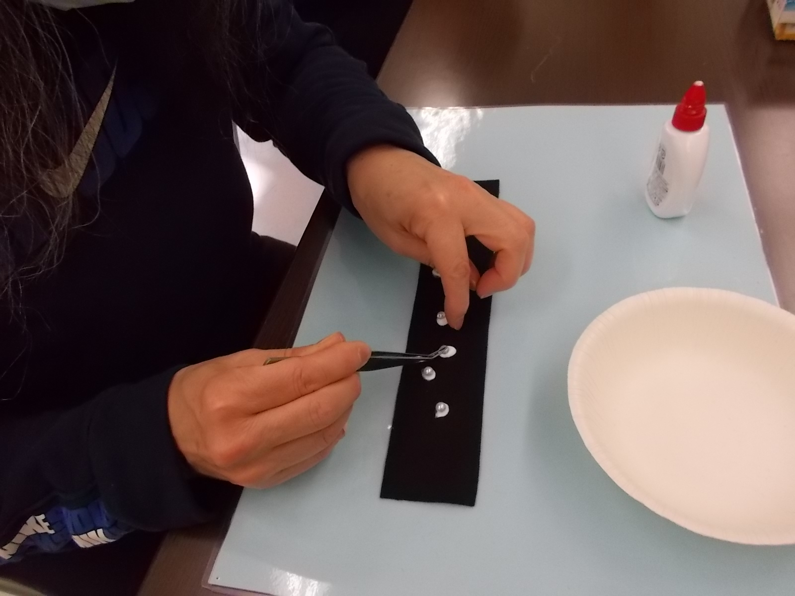 まずは器を作ります。丸い器の外側に貼るフェルトにパールのビーズをつけます。