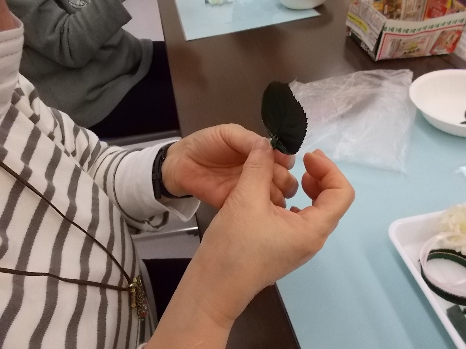 そしてプリザーブドフラワーの紫陽花とバラの葉をワイヤリングしてテーピングすればパーツの出来上がりです。
