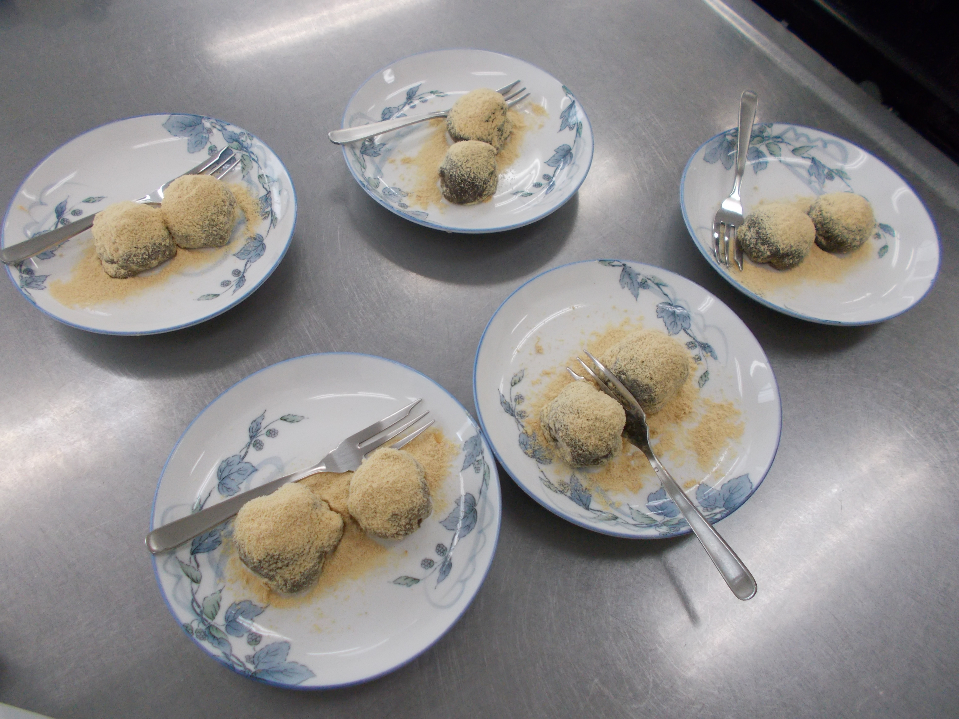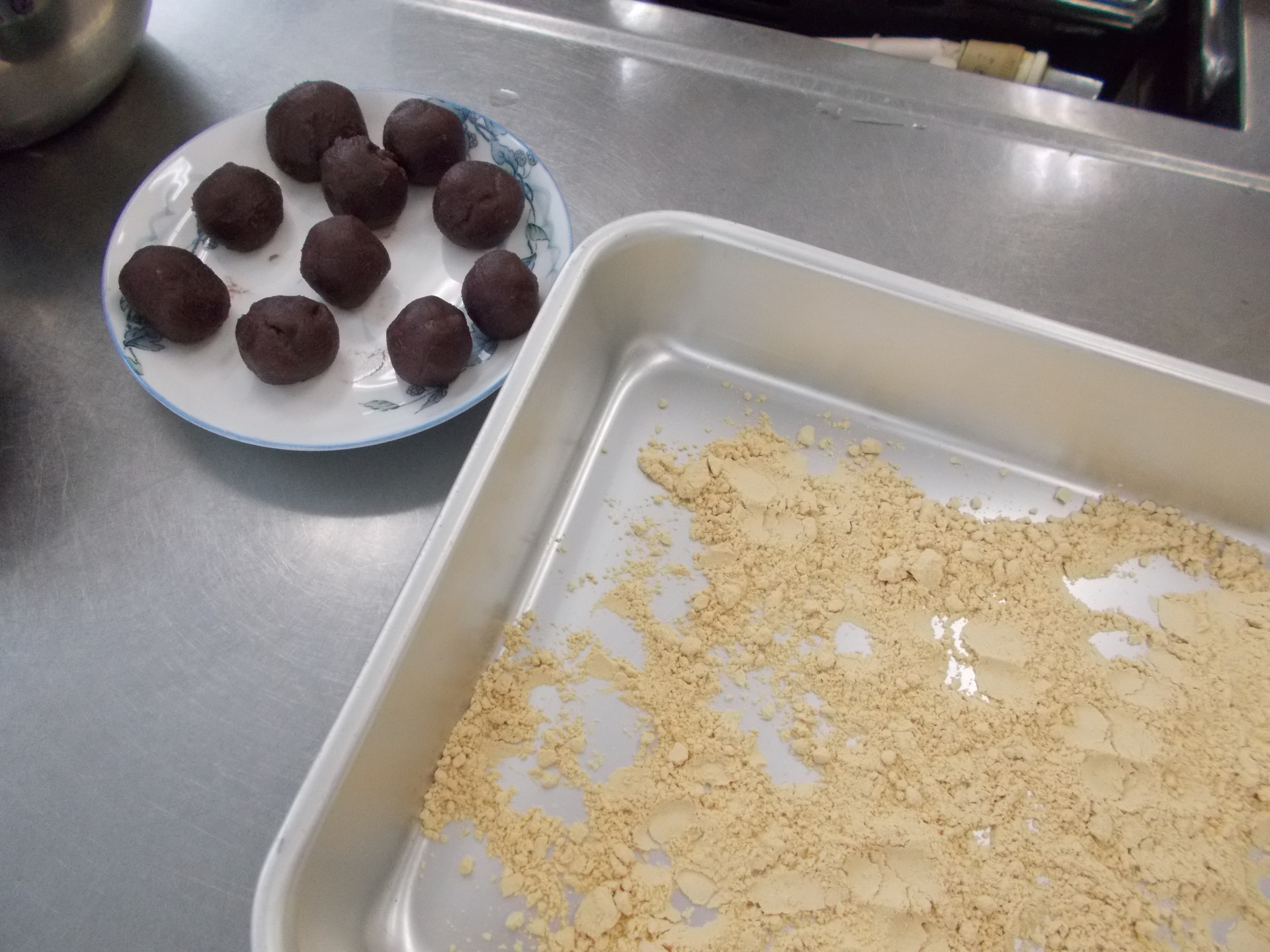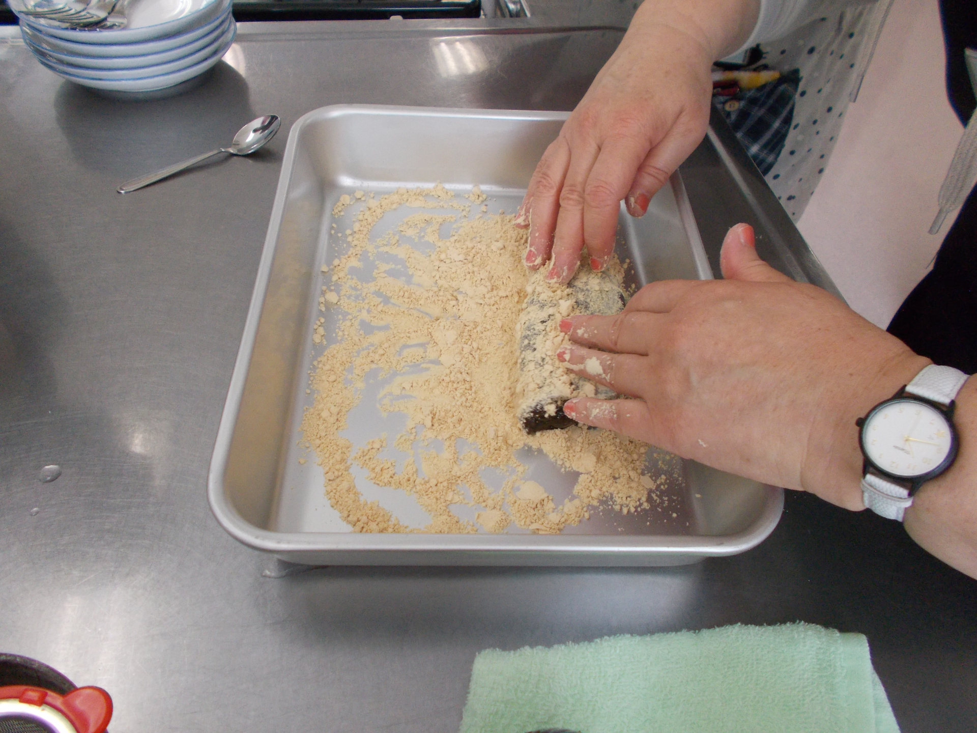練り上げた生地を黄な粉の上に落としたら、二つ折りにします。
