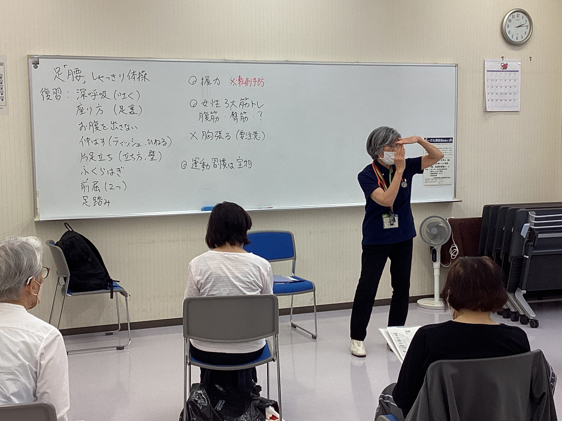 いままでの振り返り、水分を取ることの大切さ、運動をする上で注意する点等、講座が終わっても食事や運動を大事にしていただければと思います。