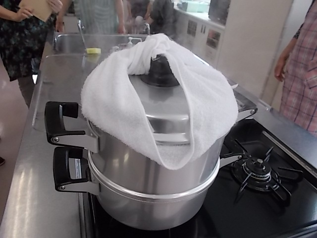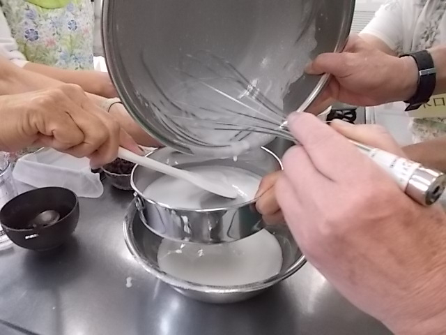 混ぜ合わせた生地を更に滑らかになるよう漉して、型に流し入れたら蒸し器で蒸します。