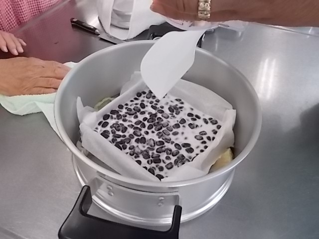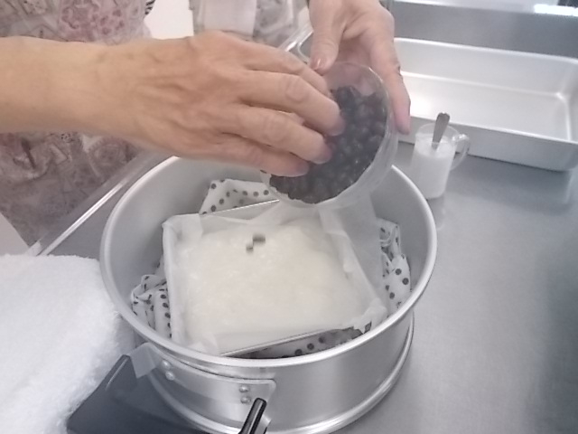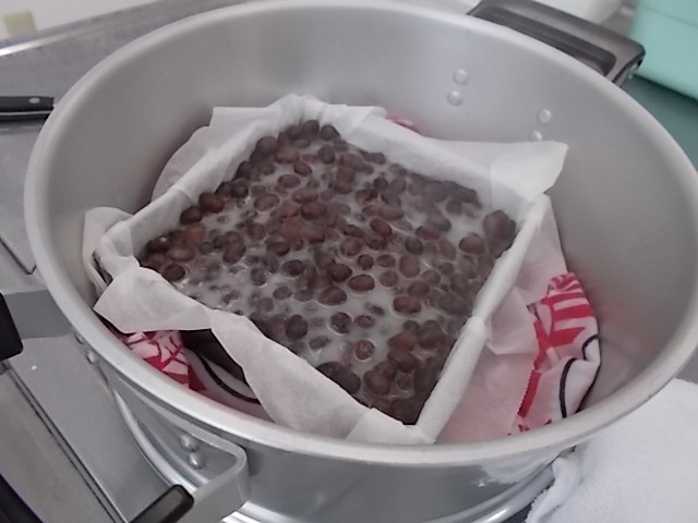 蒸しあがったら上に大納言を散らします。その上から残していた生地を流し入れます。