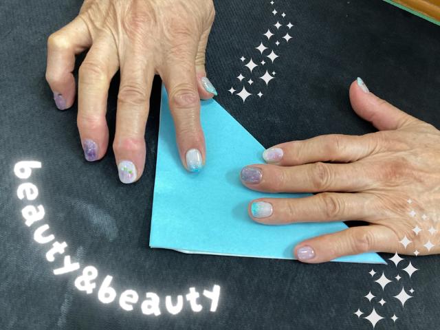 I様左薬指、右手人差し指に注目よ、ブルーカラーを先端に入れラメを全体的に入れてるの。