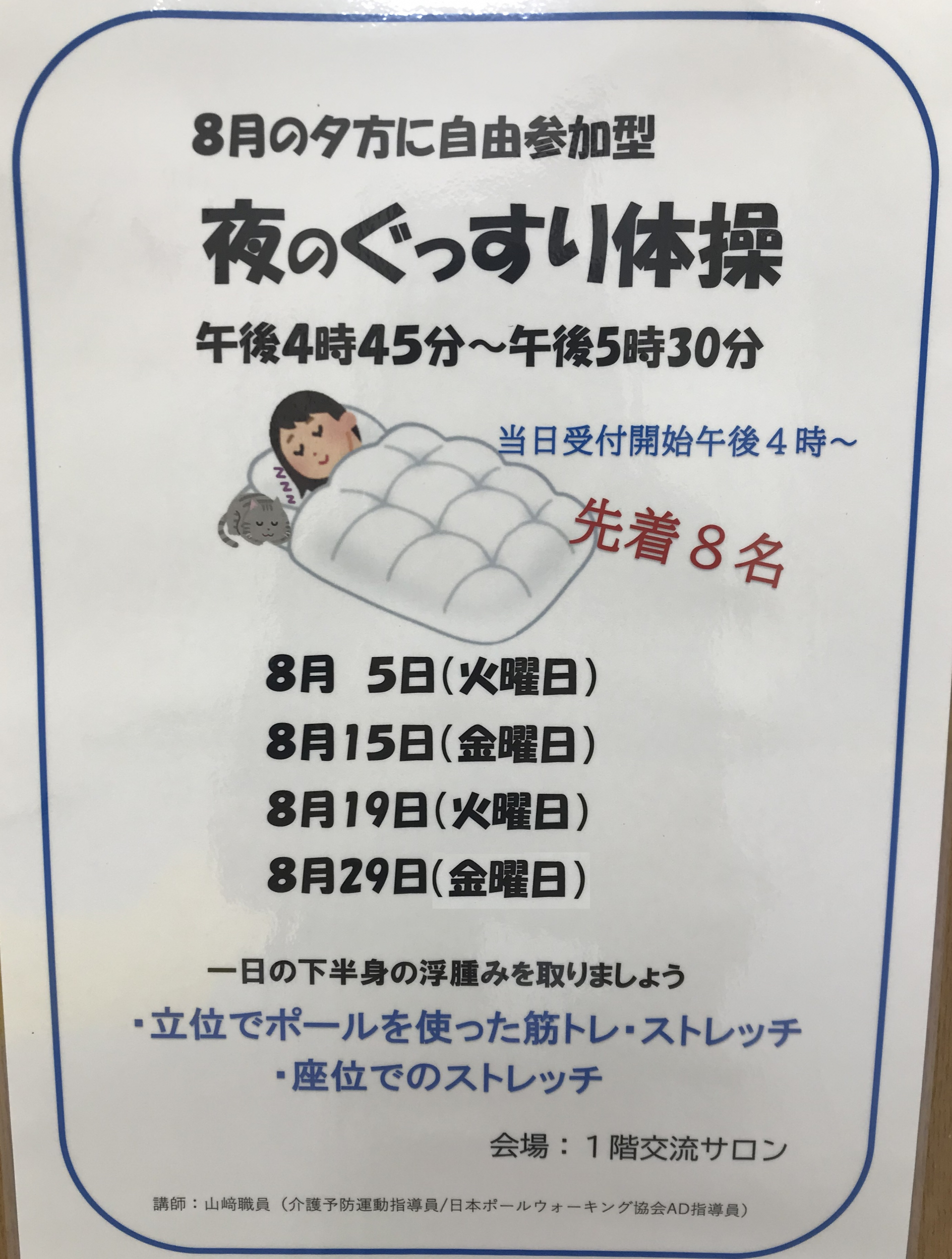 8月の暑い中ですが下記のとおり、1階交流サロンにて40分程の体操を行います。