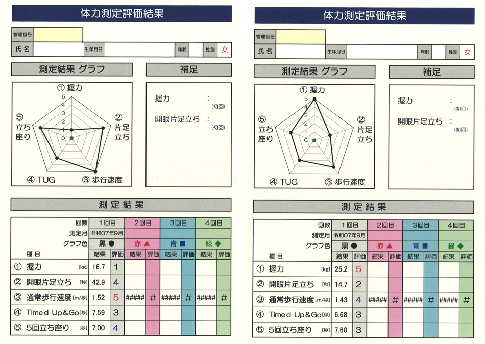 例)左の参加者様は握力が弱く、右の参加者様は片足立ちの保持が苦手なことが伺えます。