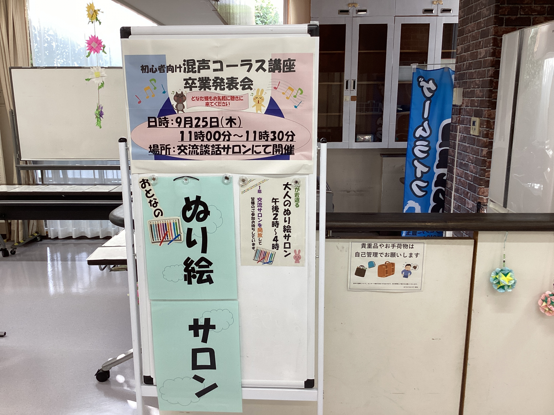 あら!サロンぬり絵の看板上に『9月25日(木) 初心者混声コーラス教室卒業発表会』のお知らせが!