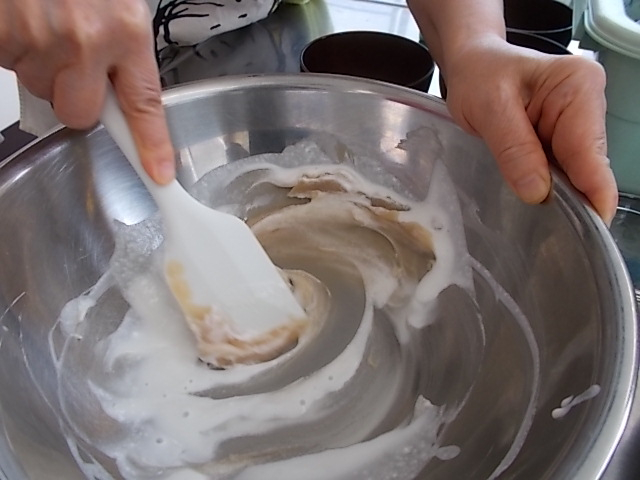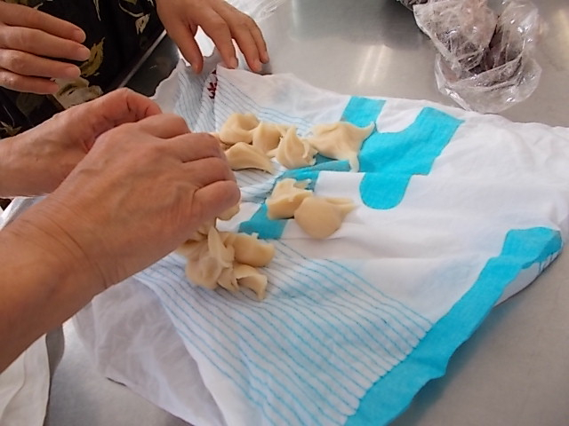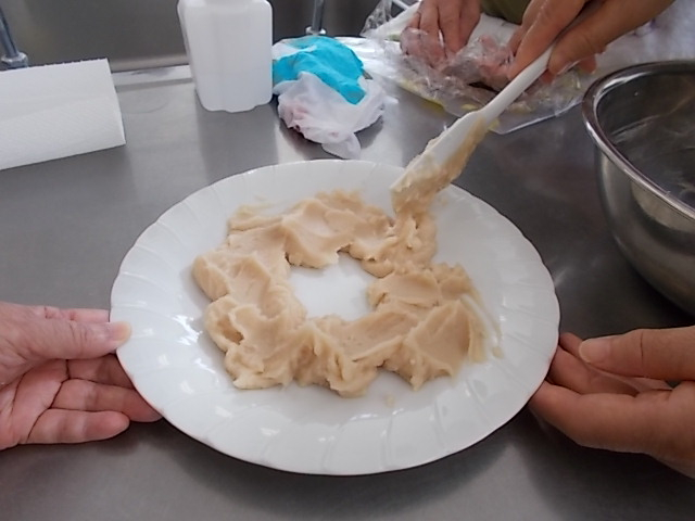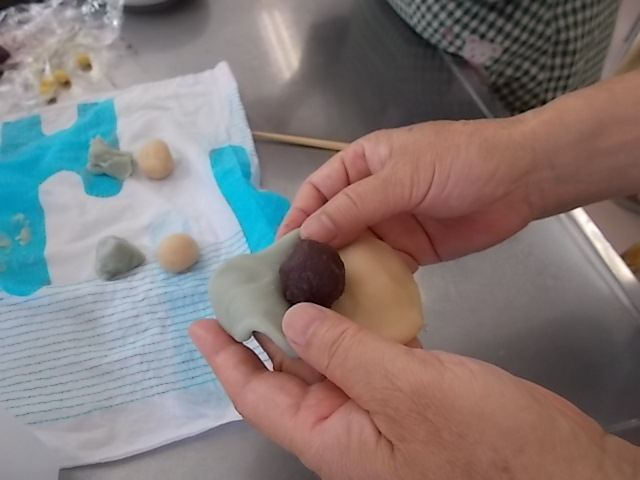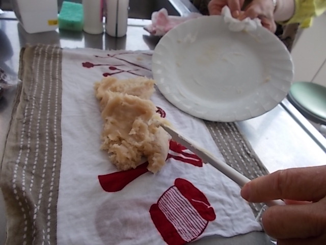 出来上がった生地を布巾の上で滑らかになるまでよくこねると、練り切りの生地の出来上がり。