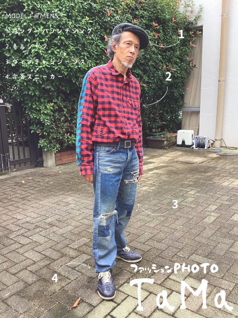 今日のポイントはハンターハンチング帽とレッドブルーネルシャツよ!