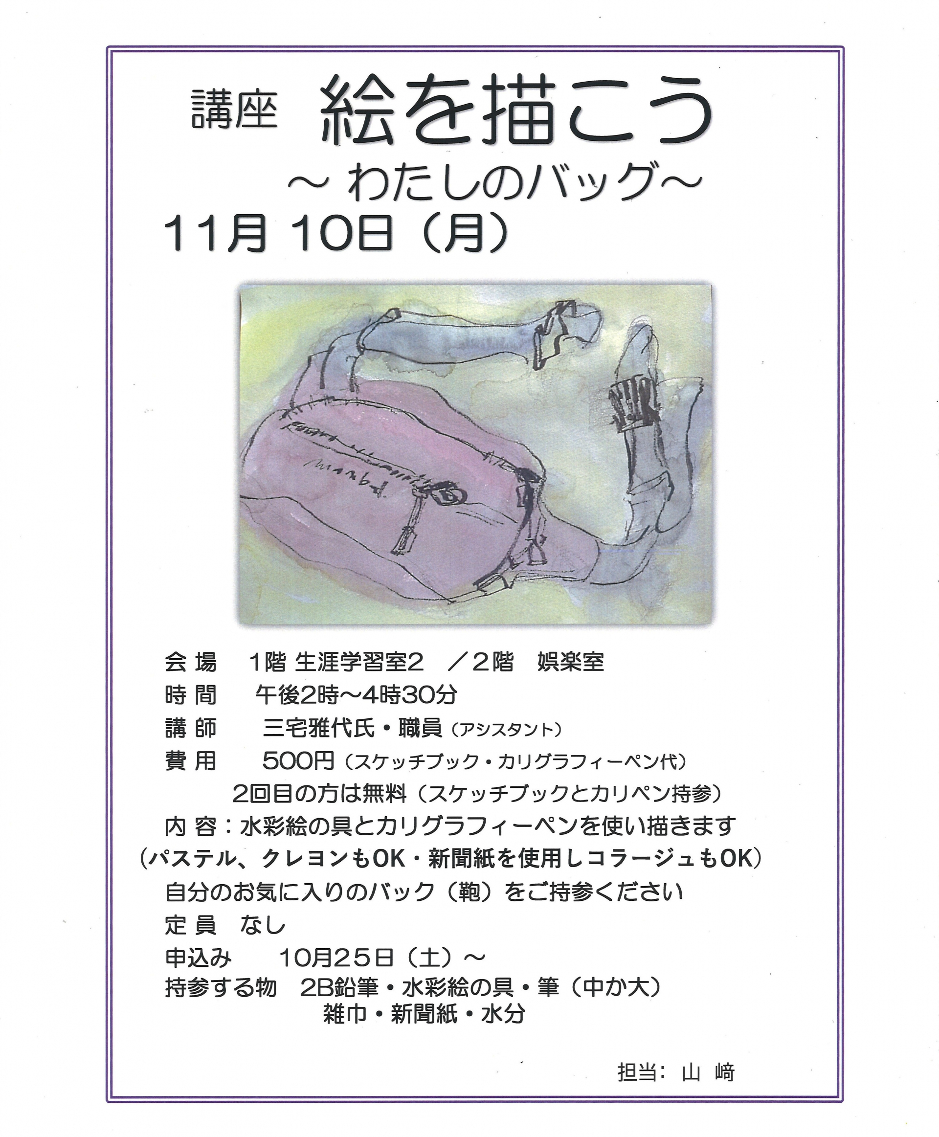 2025.10.27 活動報告 11月10日(月)絵を描こう 受付中! Tweet シェアする ~絵を描こう~ 11月講座受付中! 前の記事 2025.10.29 活動報告 ファッションPHOTO TaMa 次の記事 2025.10.27 活動報告 笑って体力づくり 「雨でも元気ハツラツ!」 一覧へ戻る