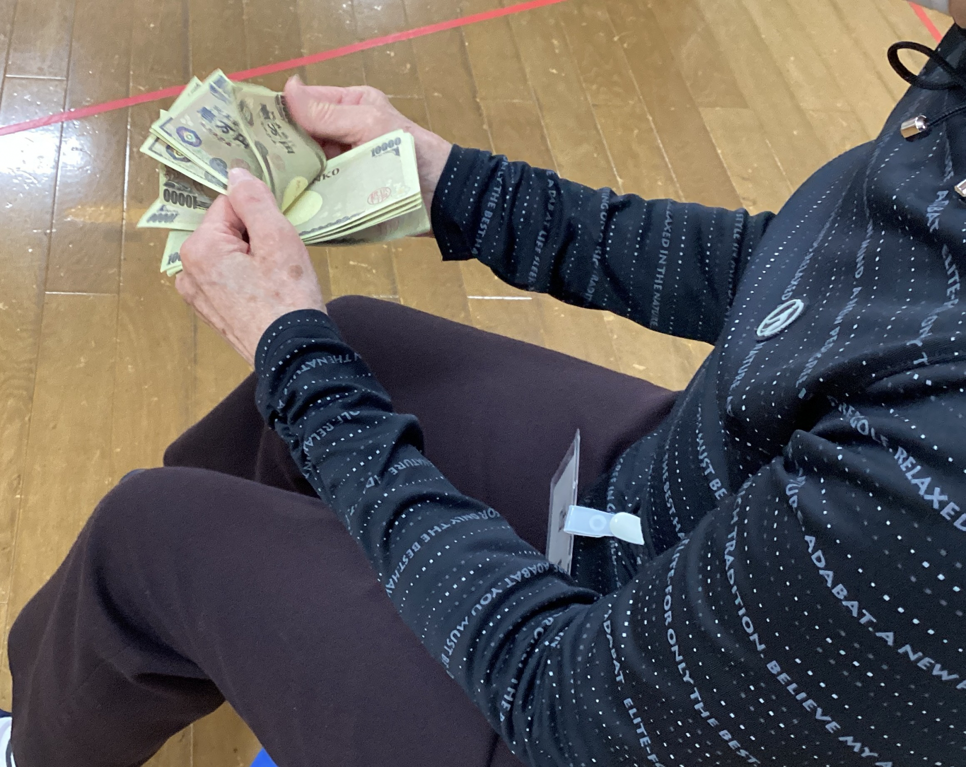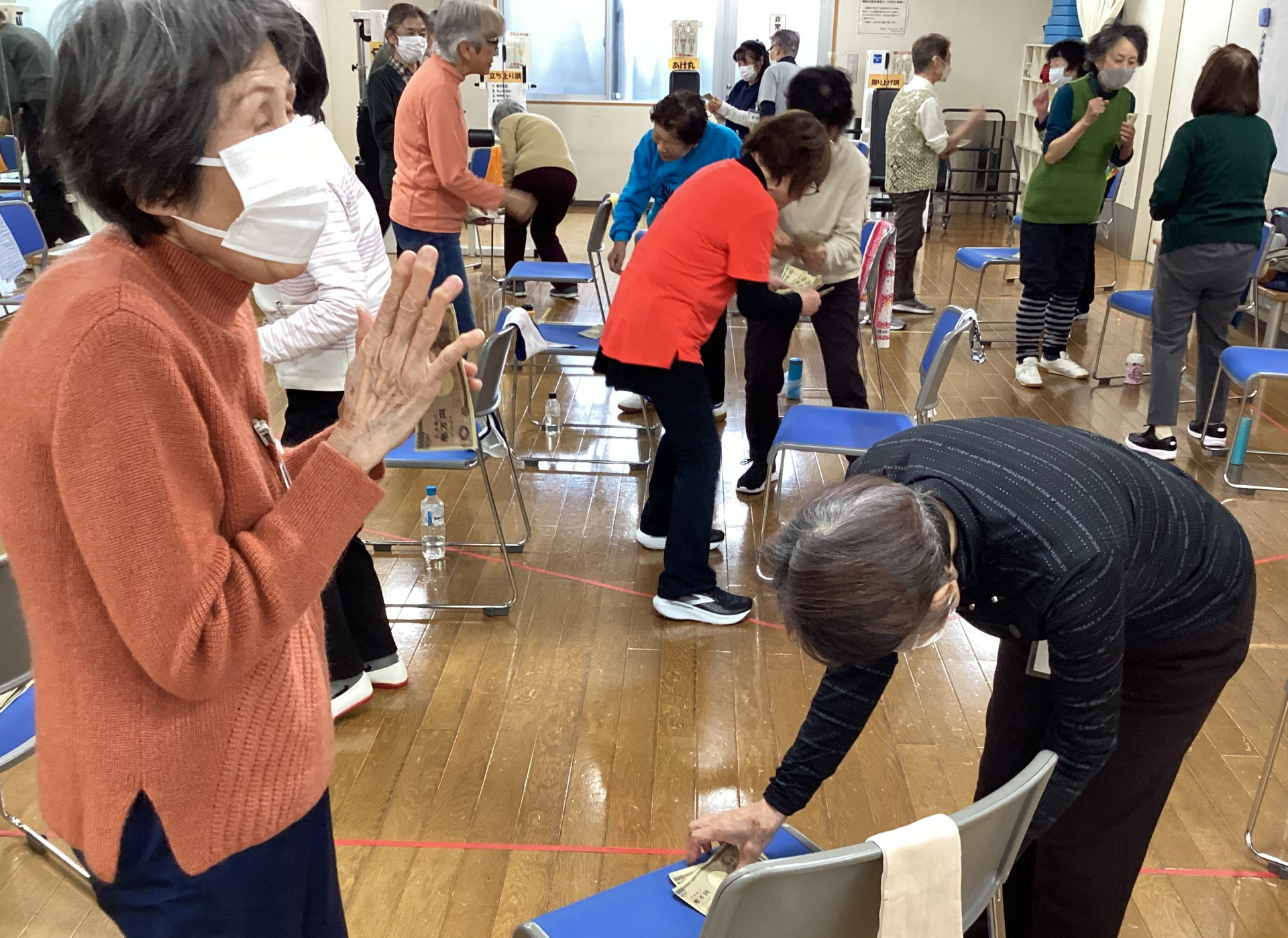 体操で身体を暖めた後はゲームです。ゲーム用紙幣を使ってのジャンケンぽんっゲーム! 勝ち進んでいくと大富豪に!