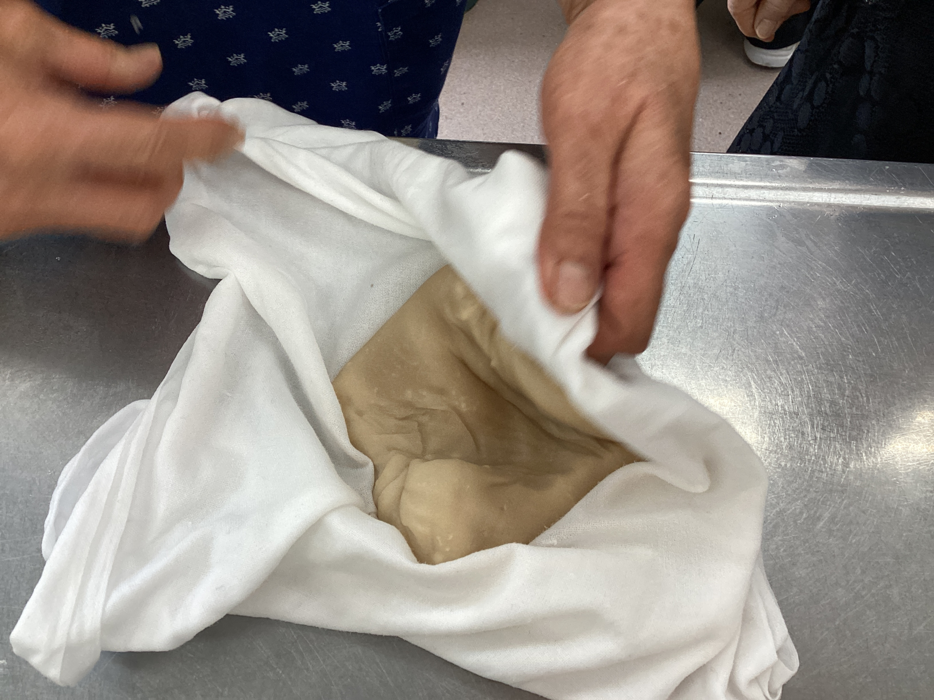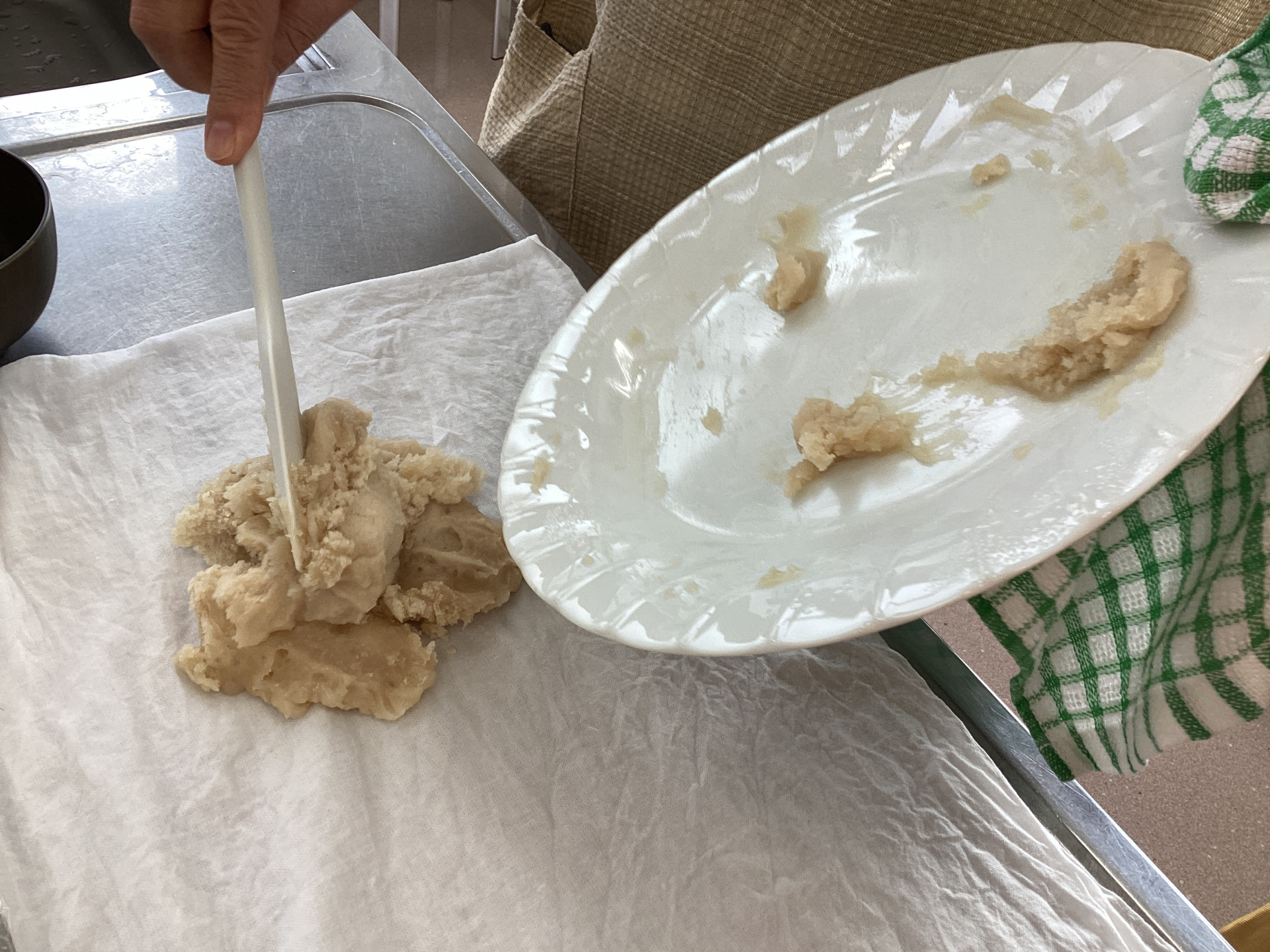 混ぜ合わせた生地をレンジにかけ水分を飛ばし、布巾の上に落とします。