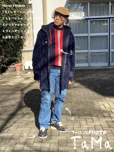 今日のポイントはこのダークパーポーのジャケットと中に来ているクリスマスカラーセーターとの組みあわせよね!