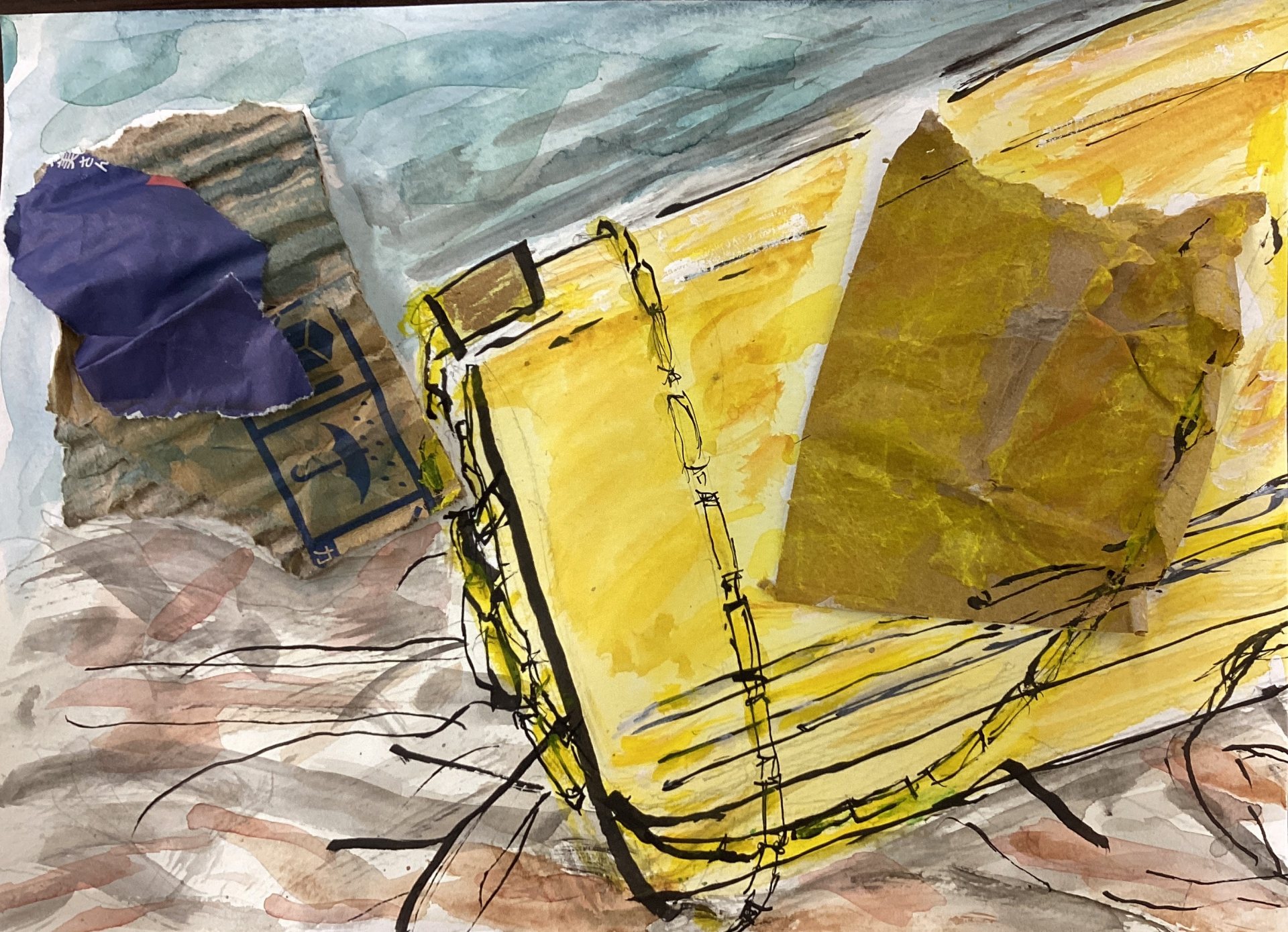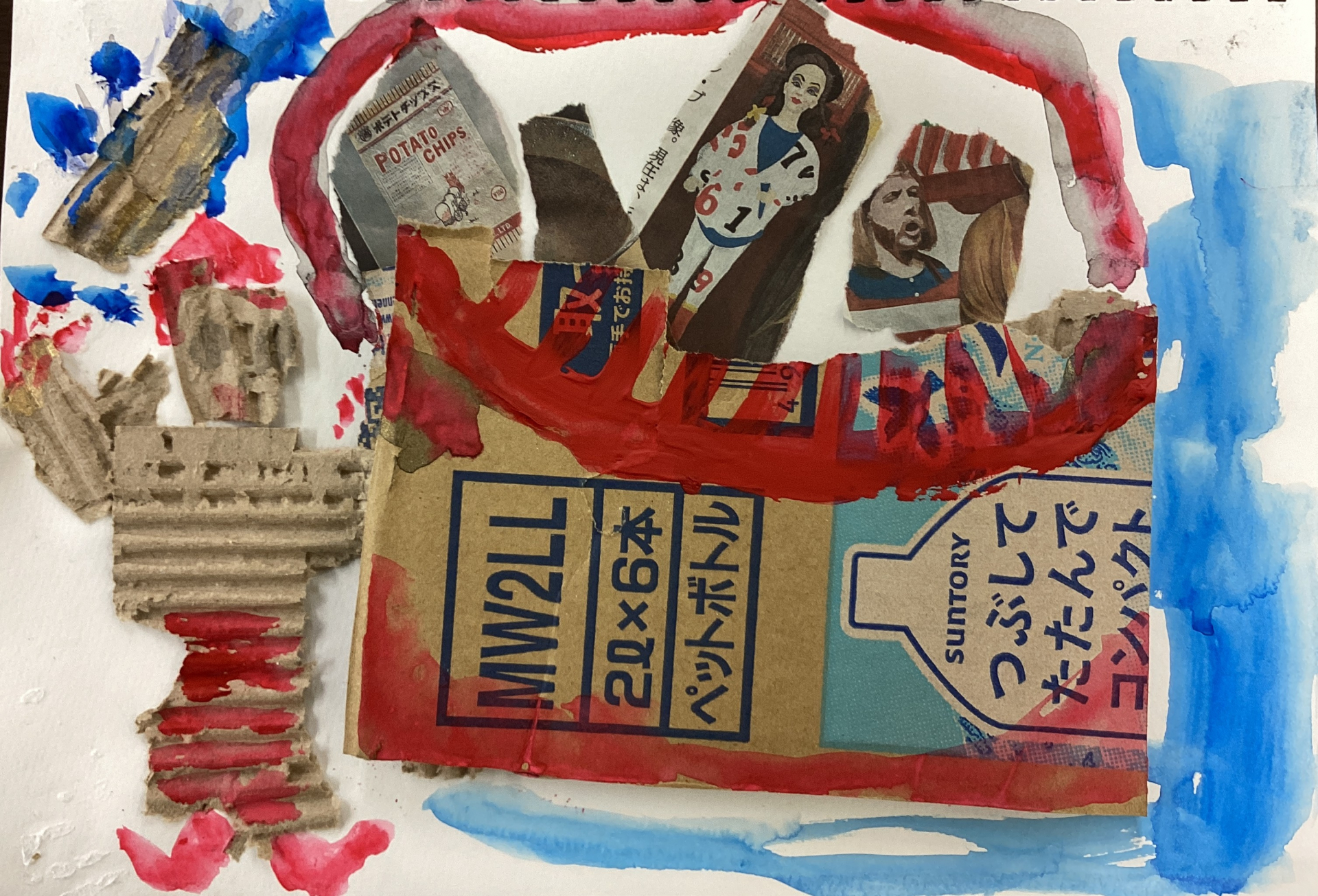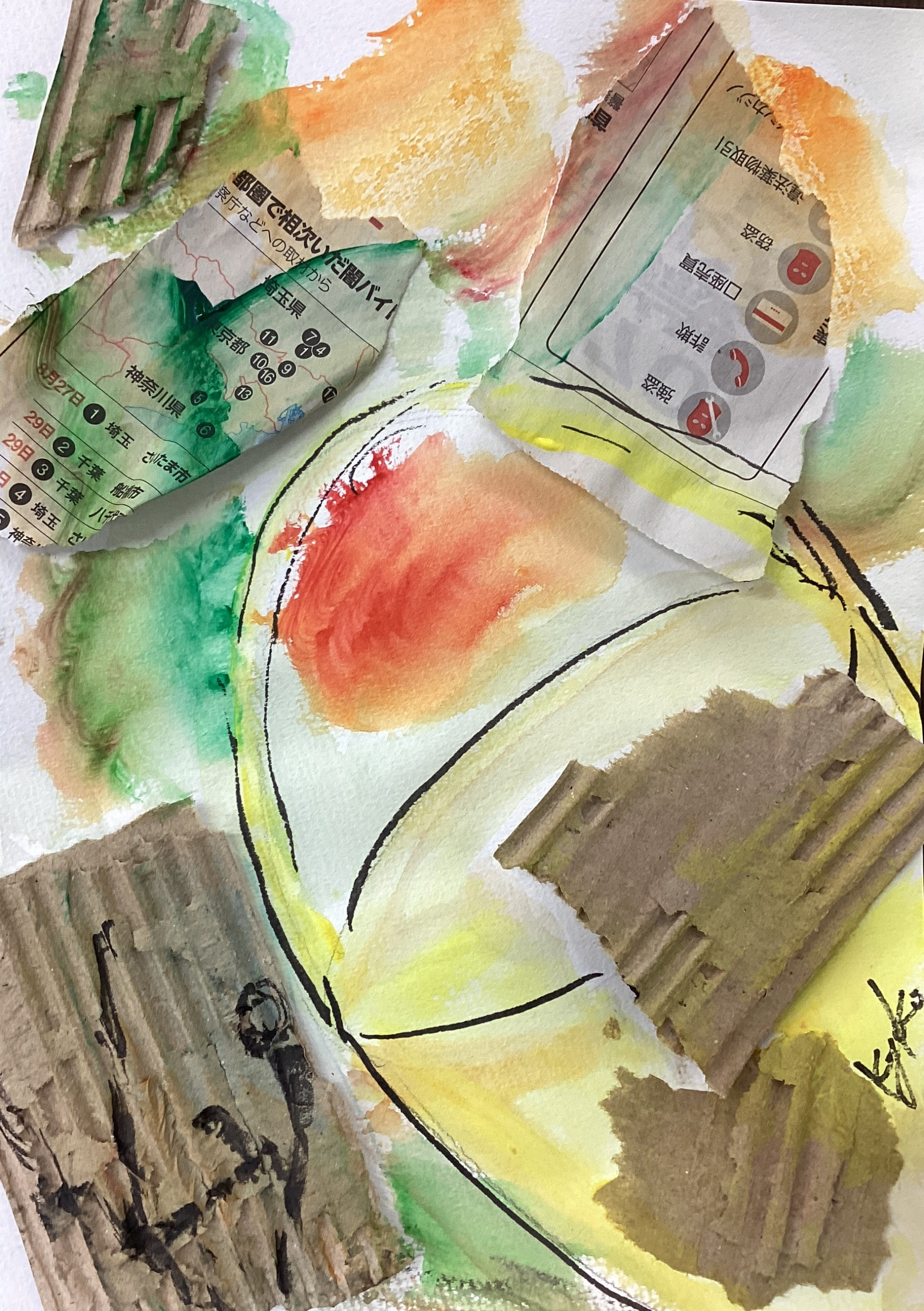 今回は、まず段ボールや新聞紙を台紙に貼ってから絵を描いて頂きました。