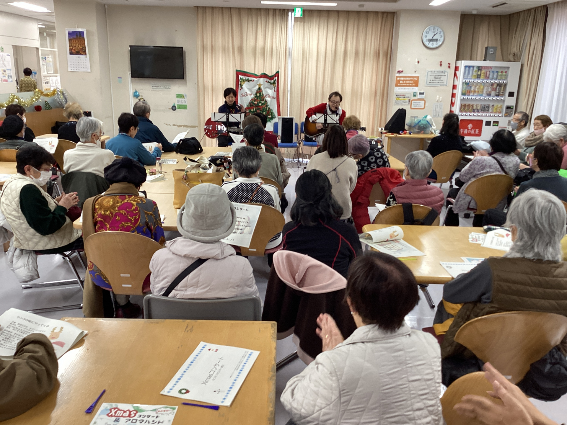 懐かしい70年代のクリスマスソングに、休憩時には「練馬区健康いきいき体操」の伴奏で椅子に座っての体操を行い、後半も歌詞カードを皆さん離さず持って、一緒に歌って下さり大合唱でした。