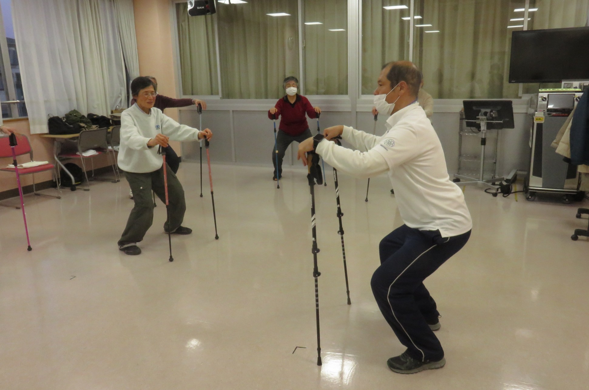 今回が初めての参加者様もいらして、ポールを使用してのウォーキングの利点や体力作りに役立つ体操をO職員にも経験してもらって、最後には頻尿予防の足のセルフケアとクールダウンを一緒に行いました。