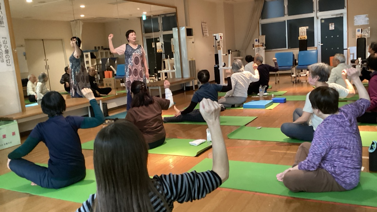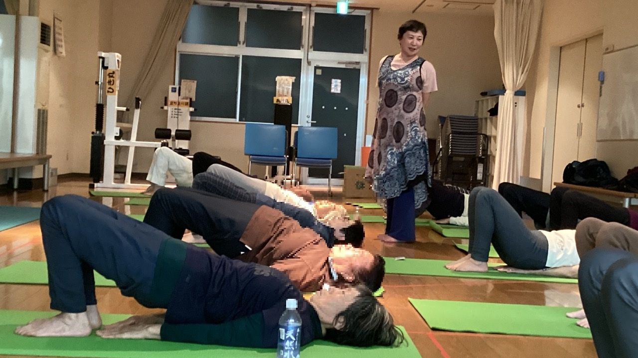 各部の手当てやストレッチの後は、膝立ちや立位・仰向けなど様々な体位でのヨガのポーズも・・・。