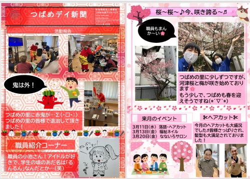 2026.03.28 NEW 今月のカレンダー作り 活動報告 2026.03.24 花見もすぐそこ ★ 活動報告 2026.03.23 つばめの里デイサービスの流行り♪ 活動報告 2026.03.21 今月の「なないろサロン」 ★ 活動報告 2026.03.19 今月の特別食 ★ 活動報告 2026.03.18 つばめの里デイサービスの落語鑑賞 活動報告 2026.03.17 3月3日 雛祭り 活動報告 2026.03.16 デイルームで花見 ★ 活動報告 2026.03.14 本日のお昼ごはんのご紹介 お食事 2026.03.13 今月の福祉ネイル ★ 活動報告 2026.03.12 つばめの里デイの日常♪ 活動報告 2026.03.11 今月のヘアカット ★ 活動報告 2026.03.11 3月ヘアカット・ネイル・サロン開催のお知らせ お知らせ 2026.03.10 もしもの災害への備え ★ お知らせ 2026.03.09 つばめデイ新聞 2026年2月号 ニュース 1 2 3 … 31