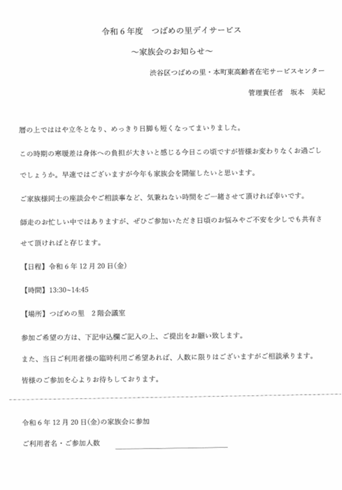 令和6年12月20日金曜日 13:30より、つばめの里2階会議室にて「家族会」を開催いたします。