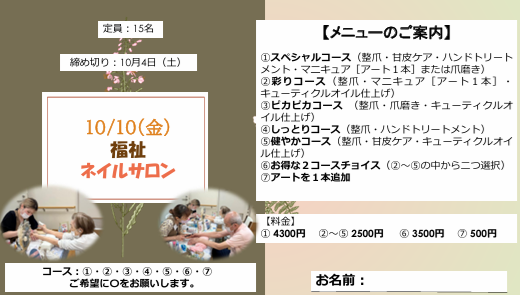 2025.10.01 お知らせ 10月の福祉ネイル開催のお知らせ Tweet シェアする 今月の福祉ネイルは10月10日金曜日に開催いたします。 臨時や振替でのご利用もご相談くださいませ。 つばめの里・本町東高齢者在宅サービスセンター M 前の記事 2025.10.01 お知らせ つばめデイ新聞 2025年8月号 次の記事 2025.09.25 お知らせ 運動会、開催! 一覧へ戻る