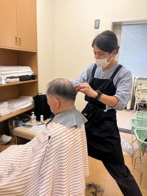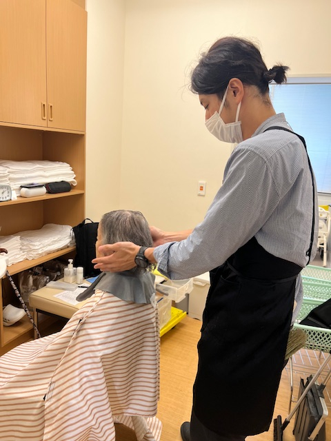 訪問美容師さんによるヘアカットを月に一回行っています。
