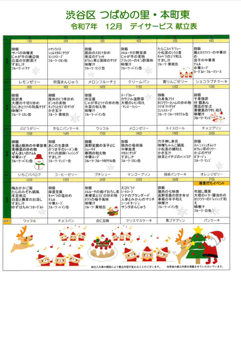 2025.12.01 お食事 12月の献立 Tweet シェアする 今月の献立をアップいたしました。 臨時や振替のご利用もご相談くださいませ。 12月献立 渋谷区つばめの里・本町東高齢者在宅サービスセンター M 前の記事 2025.12.01 お食事 12月の月間プログラム表 次の記事 2025.12.01 お食事 12月ヘアカット・ネイル・サロン開催のお知らせ 一覧へ戻る