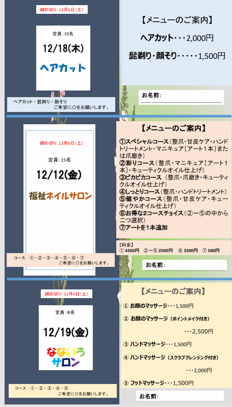 12月ヘアカット・ネイル・サロン開催のお知らせ