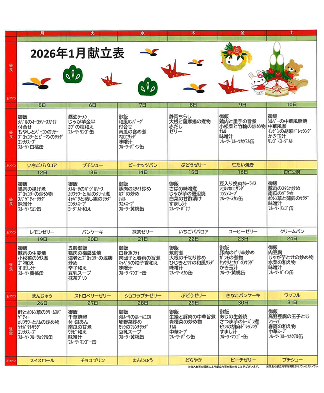 2026.01.05 お食事 1月の献立 Tweet シェアする 今月の献立をアップいたしました。 臨時や振替のご利用もご相談くださいませ。 1月献立.pdf 渋谷区つばめの里・本町東高齢者在宅サービスセンター M 前の記事 2026.01.05 お食事 謹んで新春のお慶びを申し上げます ★ 次の記事 2025.12.26 お食事 クリスマス会☆彡 一覧へ戻る