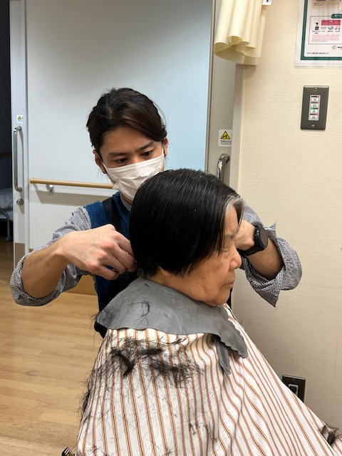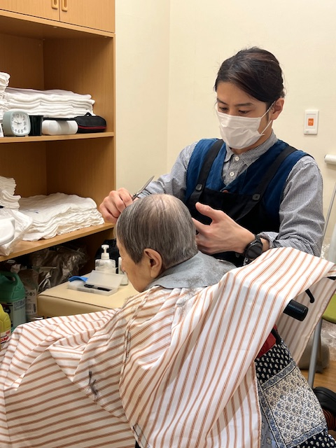 訪問美容師さんによるヘアカットを月に一回行っています。