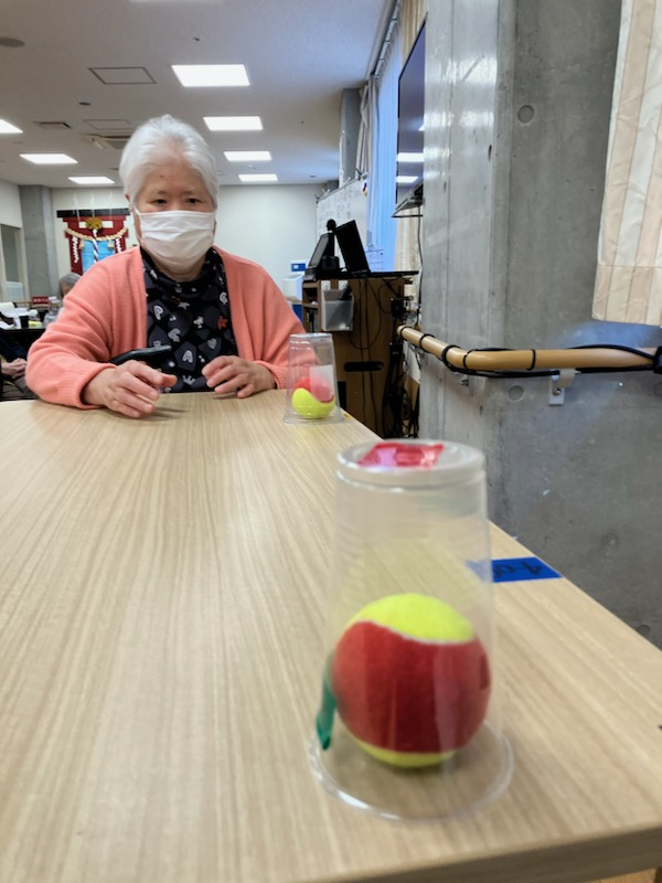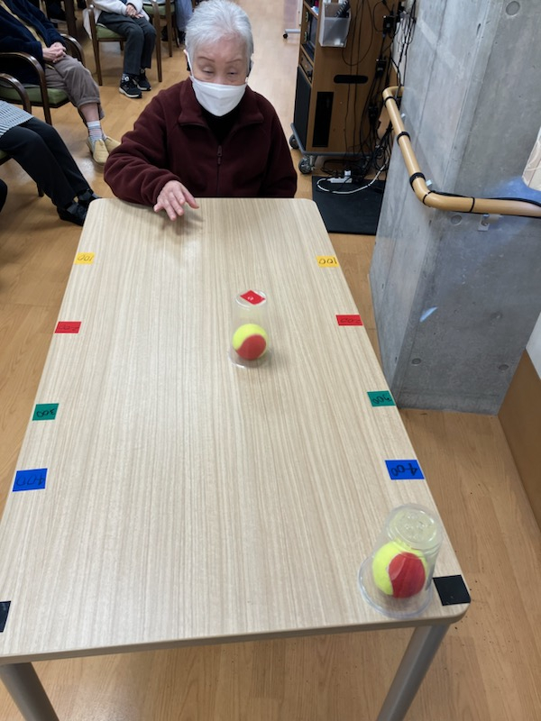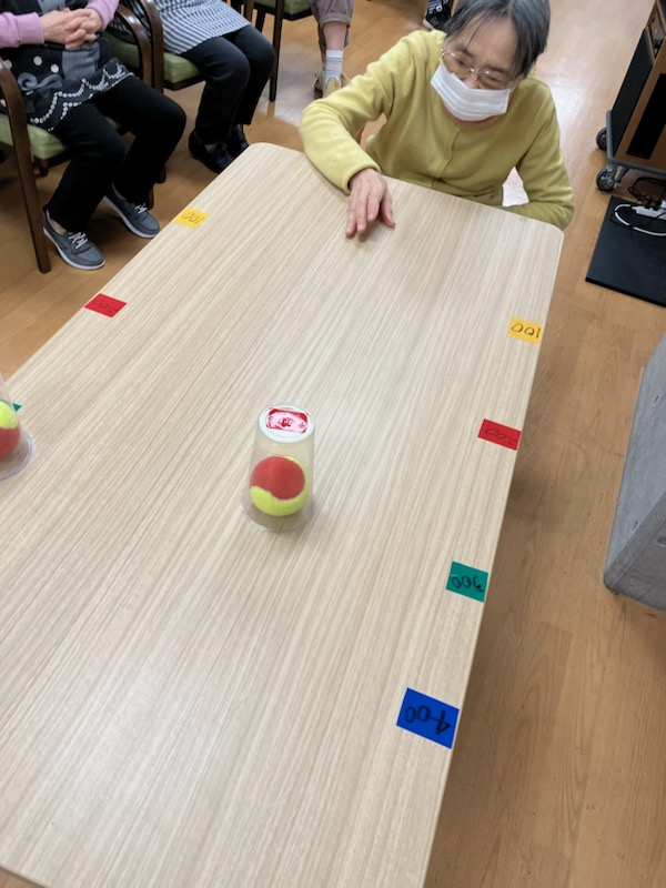 ルールは簡単!透明なカップの中にボールを入れ、テーブルから落ちないギリギリの所まで滑らせて止めるというゲームとなっております(#^.^#)