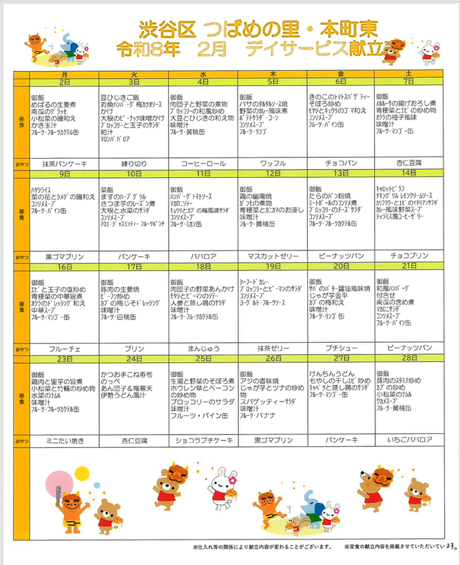 2026.02.02 お食事 2月の献立 Tweet シェアする 今月の献立をアップいたしました。 臨時や振替のご利用もご相談くださいませ。 2月献立pdf 渋谷区つばめの里・本町東高齢者在宅サービスセンター M 前の記事 2026.02.04 お食事 立春を迎えました 次の記事 2026.01.31 お食事 今月の「なないろサロン」 ★ 一覧へ戻る