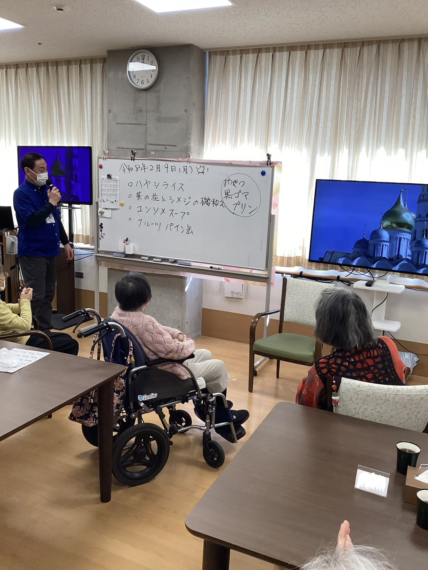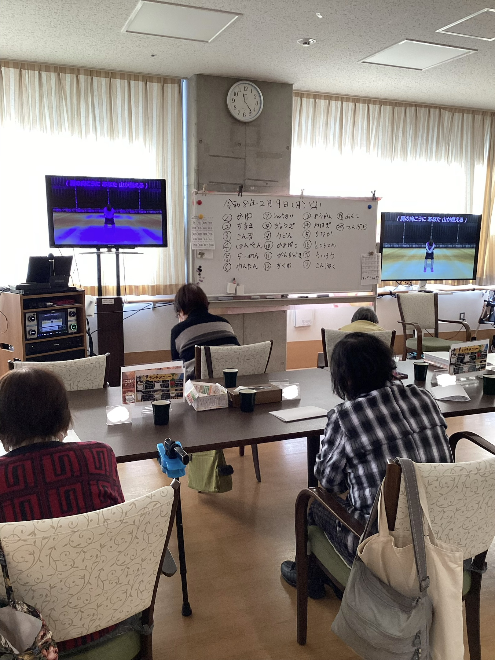 テレビで動画を流して、腕や足などの体操、口腔体操を行っています。