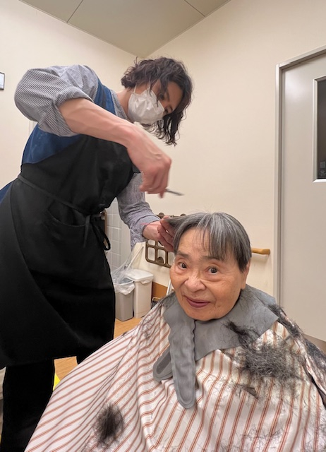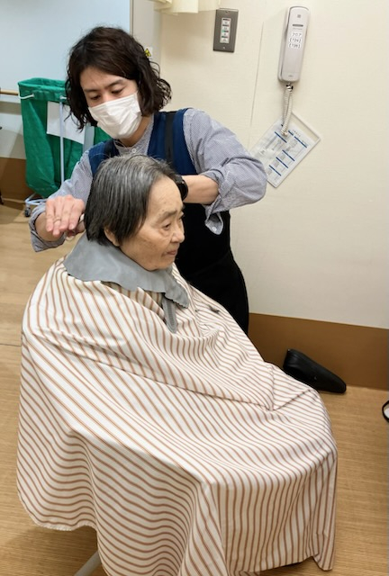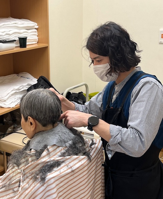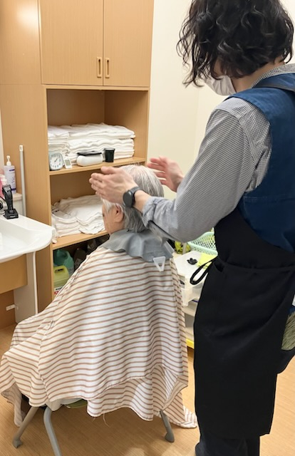 訪問美容師さんによるヘアカットを月に一回行っています。